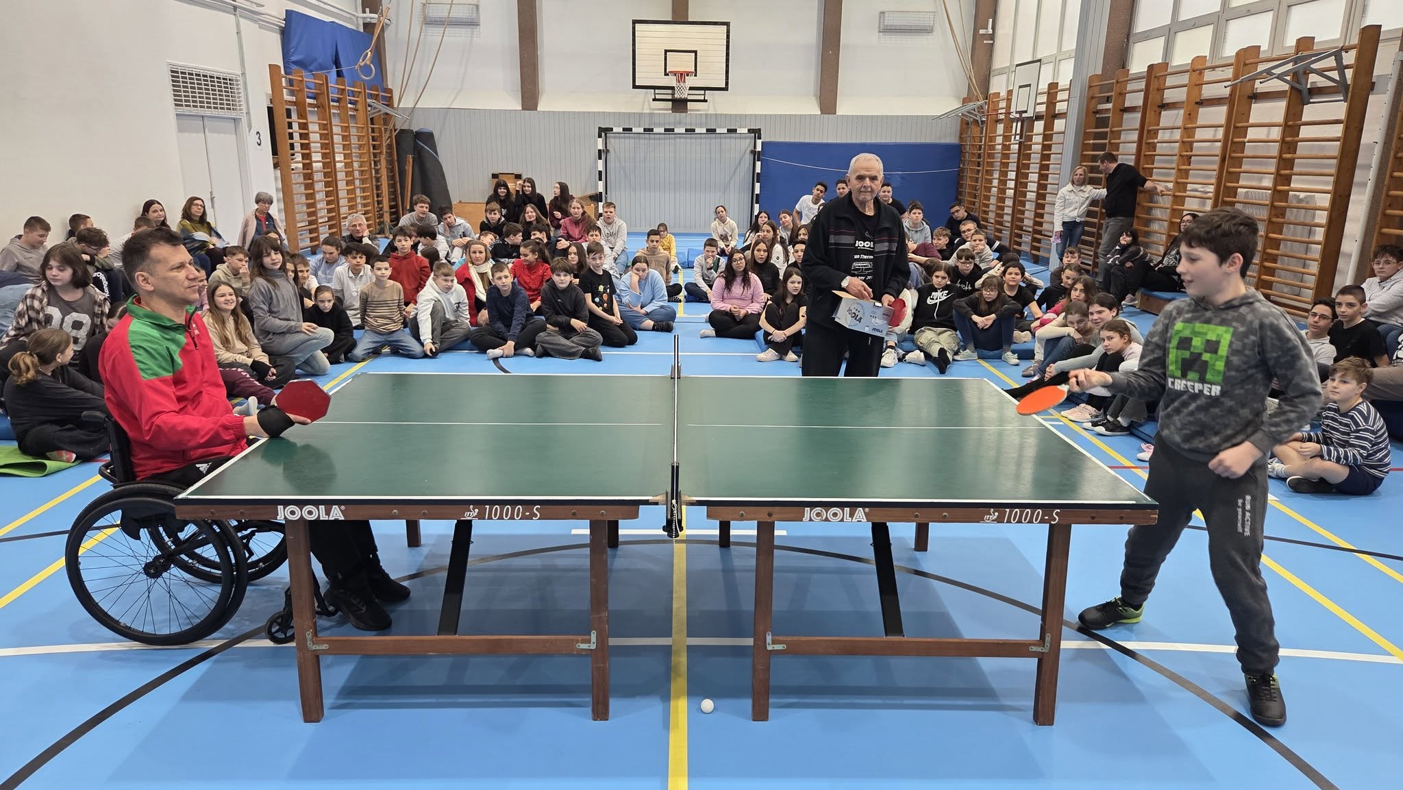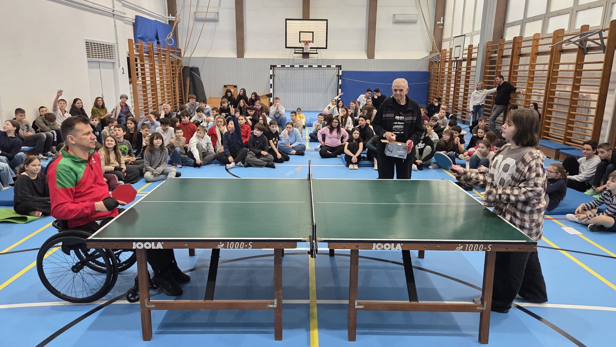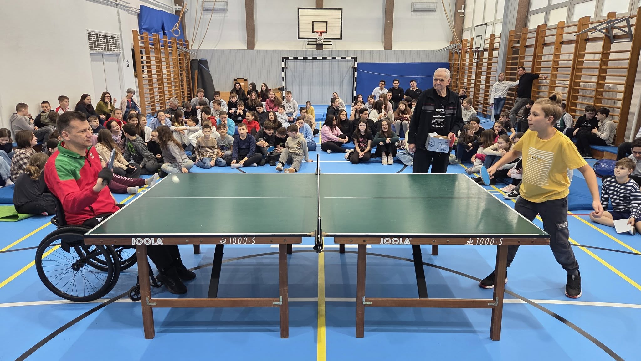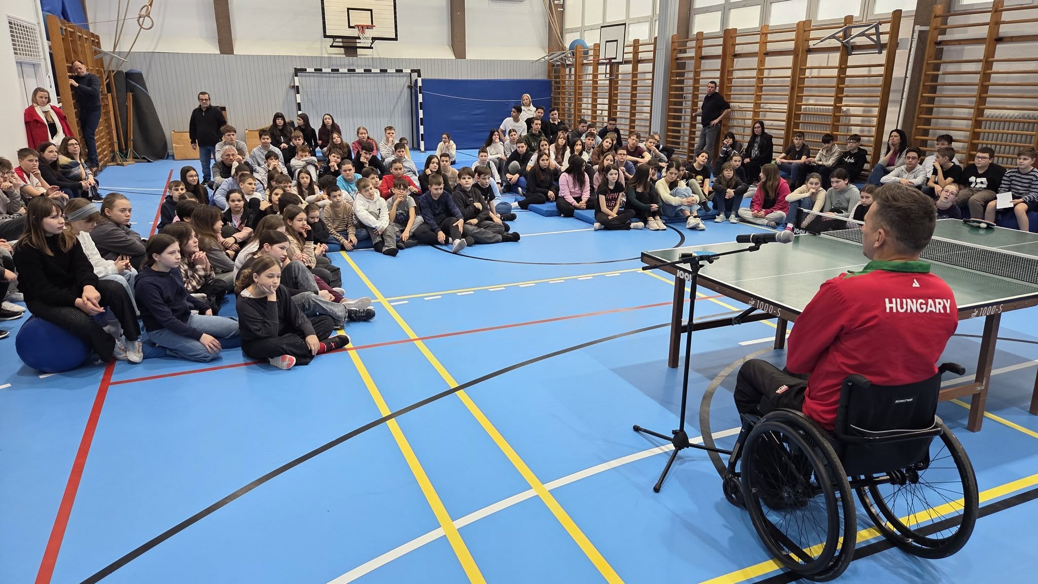 Első órában a felsősök fesztivál jellegű foglalkozáson próbáltak olyan mozgásokat, melyek közben valamilyen nehezítő körülménnyel találkoztak. Ülőröplabdáztak, csörgőlabdáztak többek között. A nap folyamán meghallgattuk Urlauber Ádám, paralimpikon asztaliteniszező előadását, melynek végén tanulóink kipróbálhatták magukat ellene.