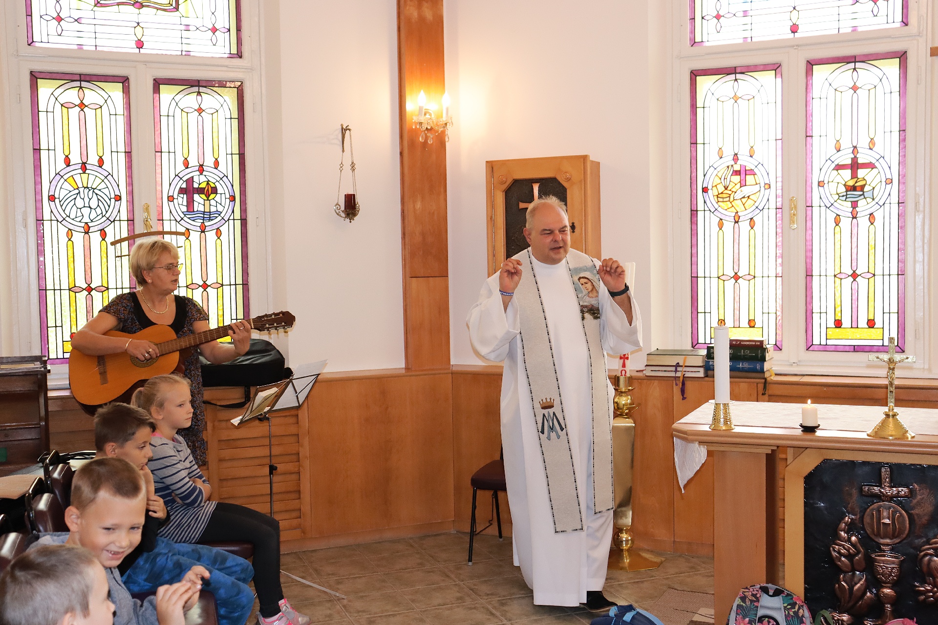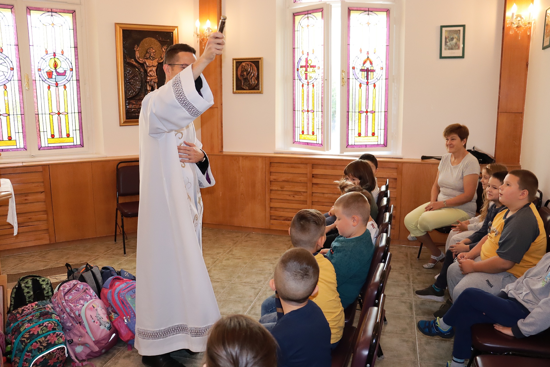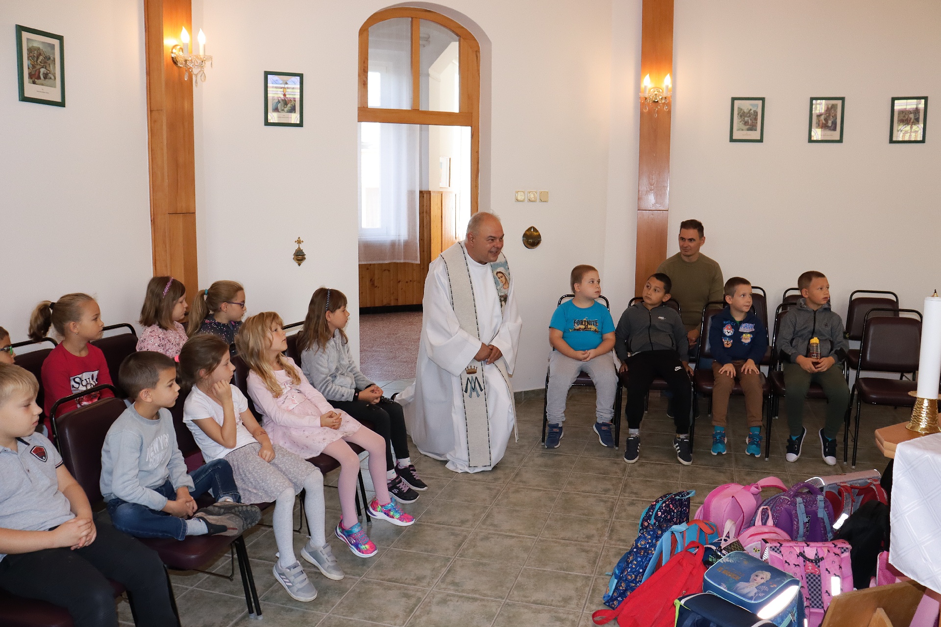 Hagyományainkhoz híven idén is táskaszentelésre került sor iskolánk kápolnájában. Hozdik Zsolt kanonok plébános atya és Kovács Ferenc iskolalelkész megáldották a kis elsőseink táskáit és ezzel a szép útravalóval látták el a gyerekeket: „A táskákban a felszerelésünket hordjuk és Jézust a szívünkben hordozzuk.”.