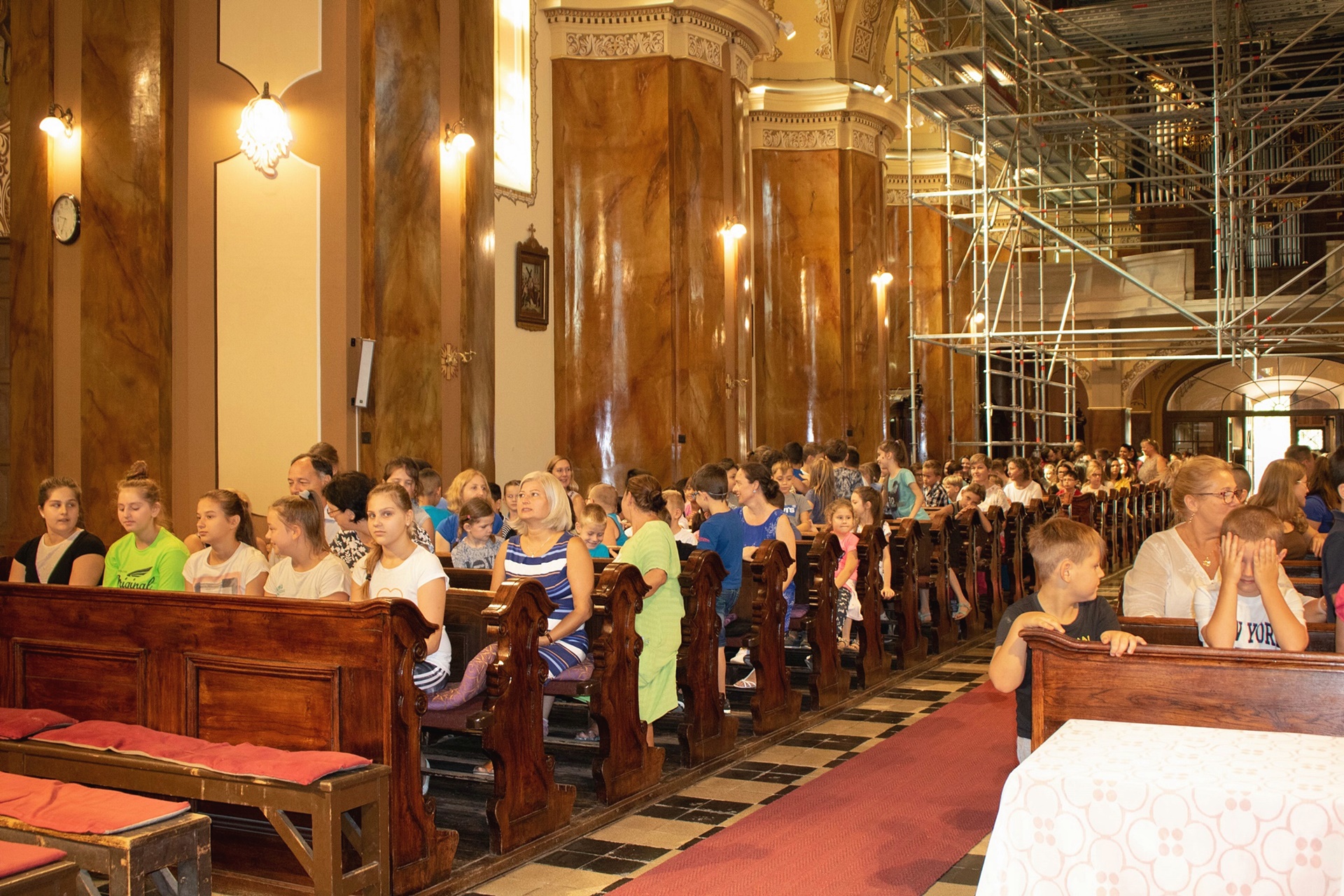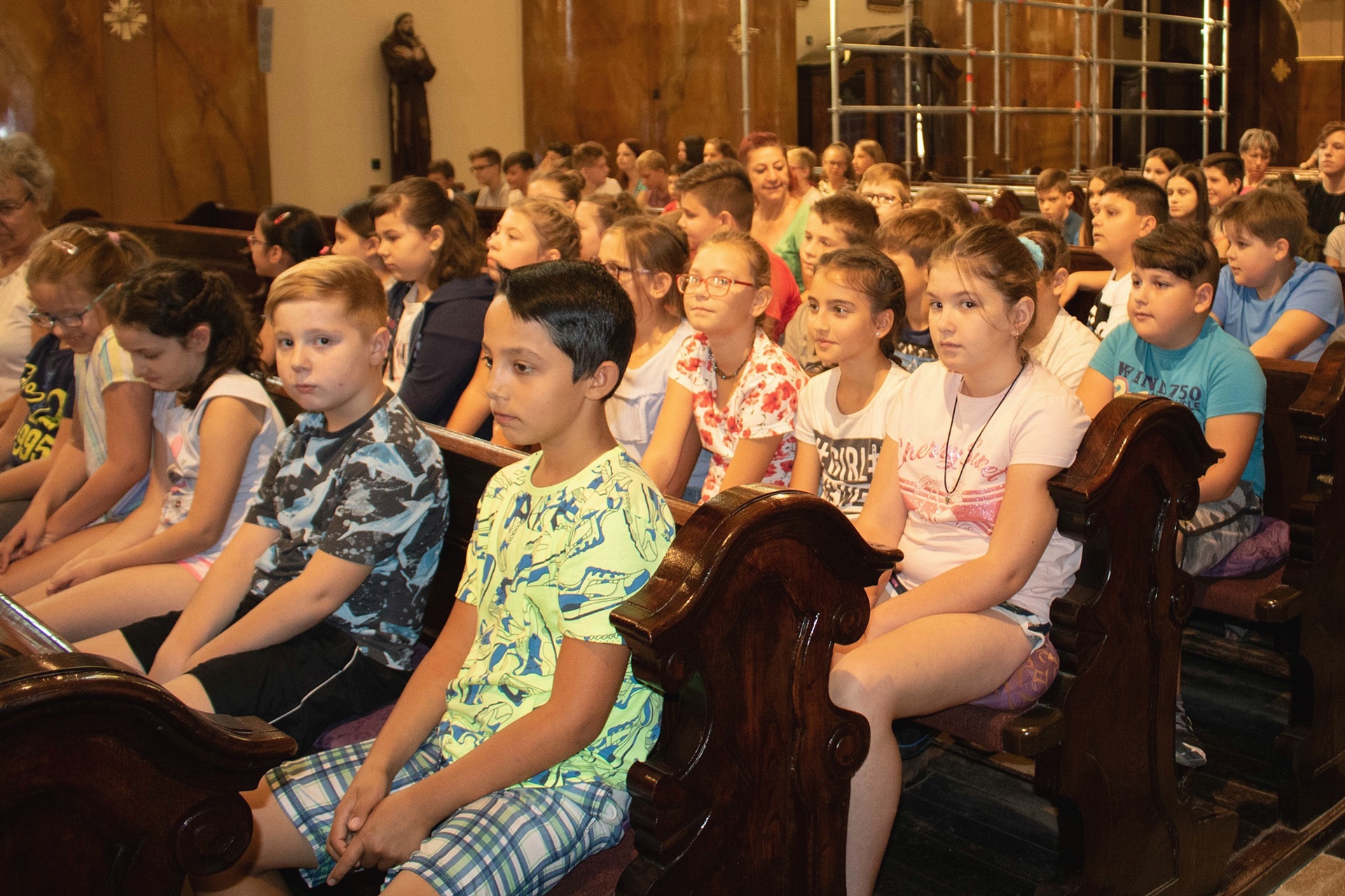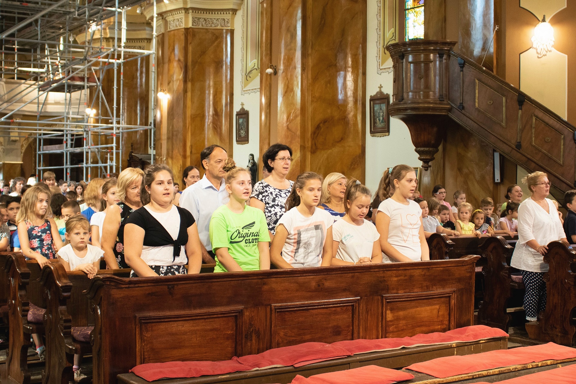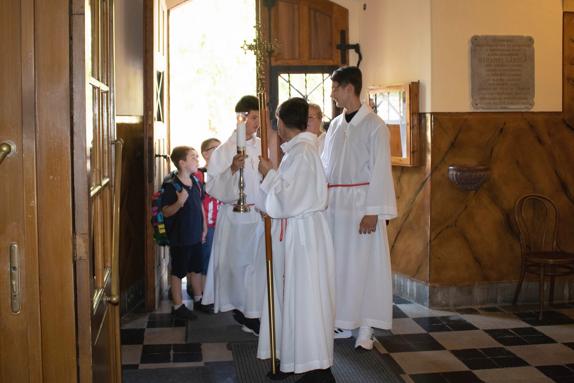 Első tanítási napunkon átvonultunk a templomba. Csorba Dávid atya Isten áldását kérte iskolánkra az új tanévre, és megáldotta az elsősök iskolatáskáit.