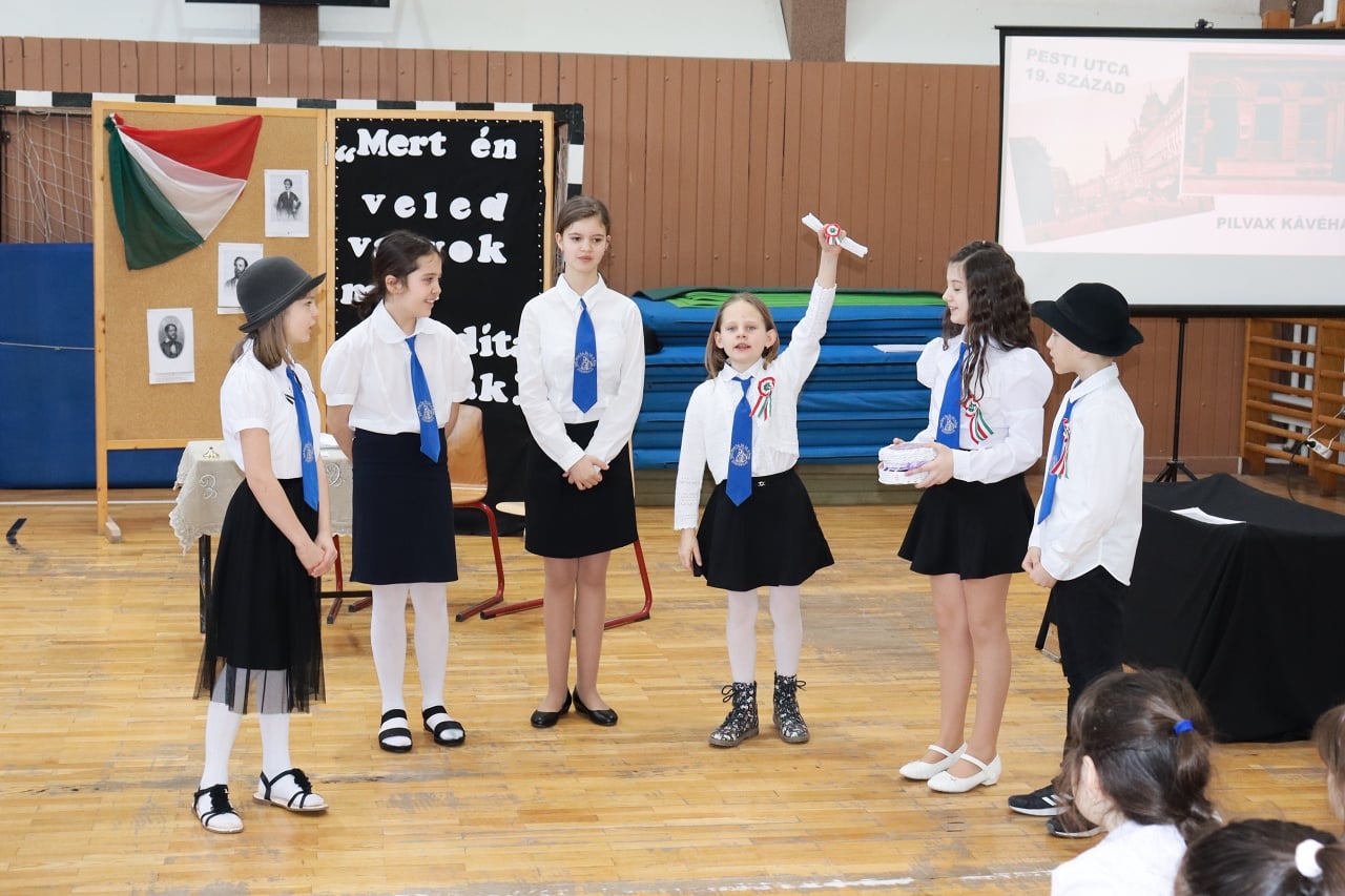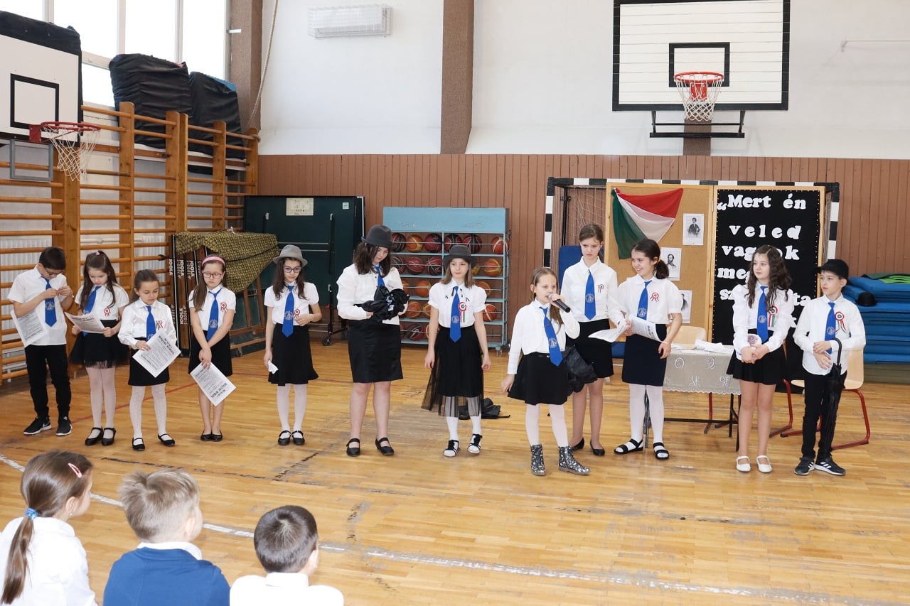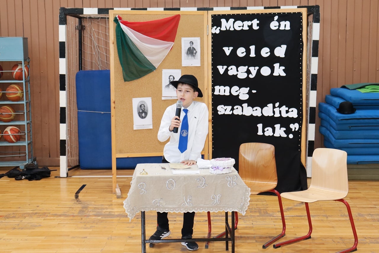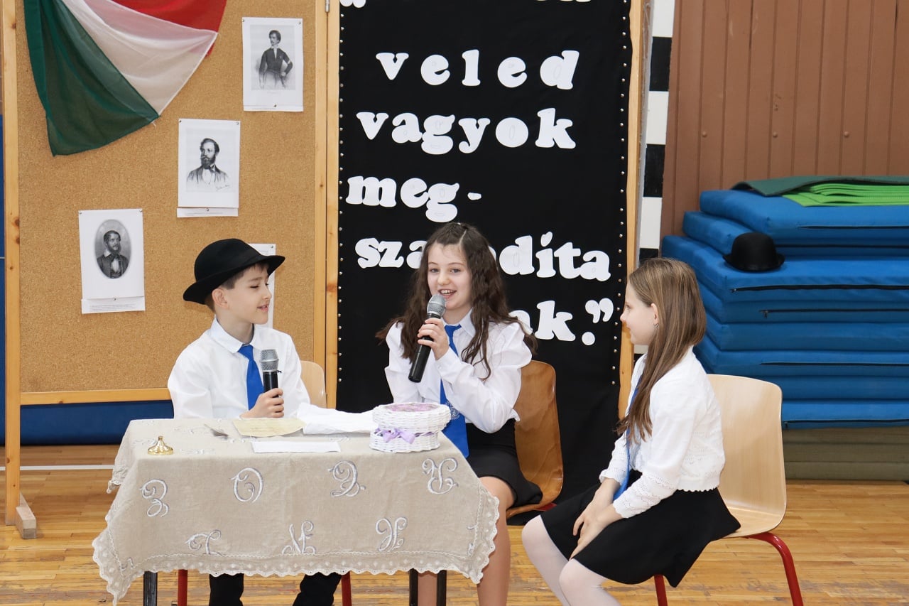 1848. március 15-ről megemlékező műsorunkat Jakus Zita tanárnő szervezésében a színjátszó szakkörös tanulóink mutatták be. Katolikus iskolához méltó, szép bevezető gondolatok után e nap történéseit jelenítették meg a lelkes, bátor kiállású gyerekek. Végül, tisztelegve a nemzeti hőseink előtt, közösen elénekeltük a Himnuszt.