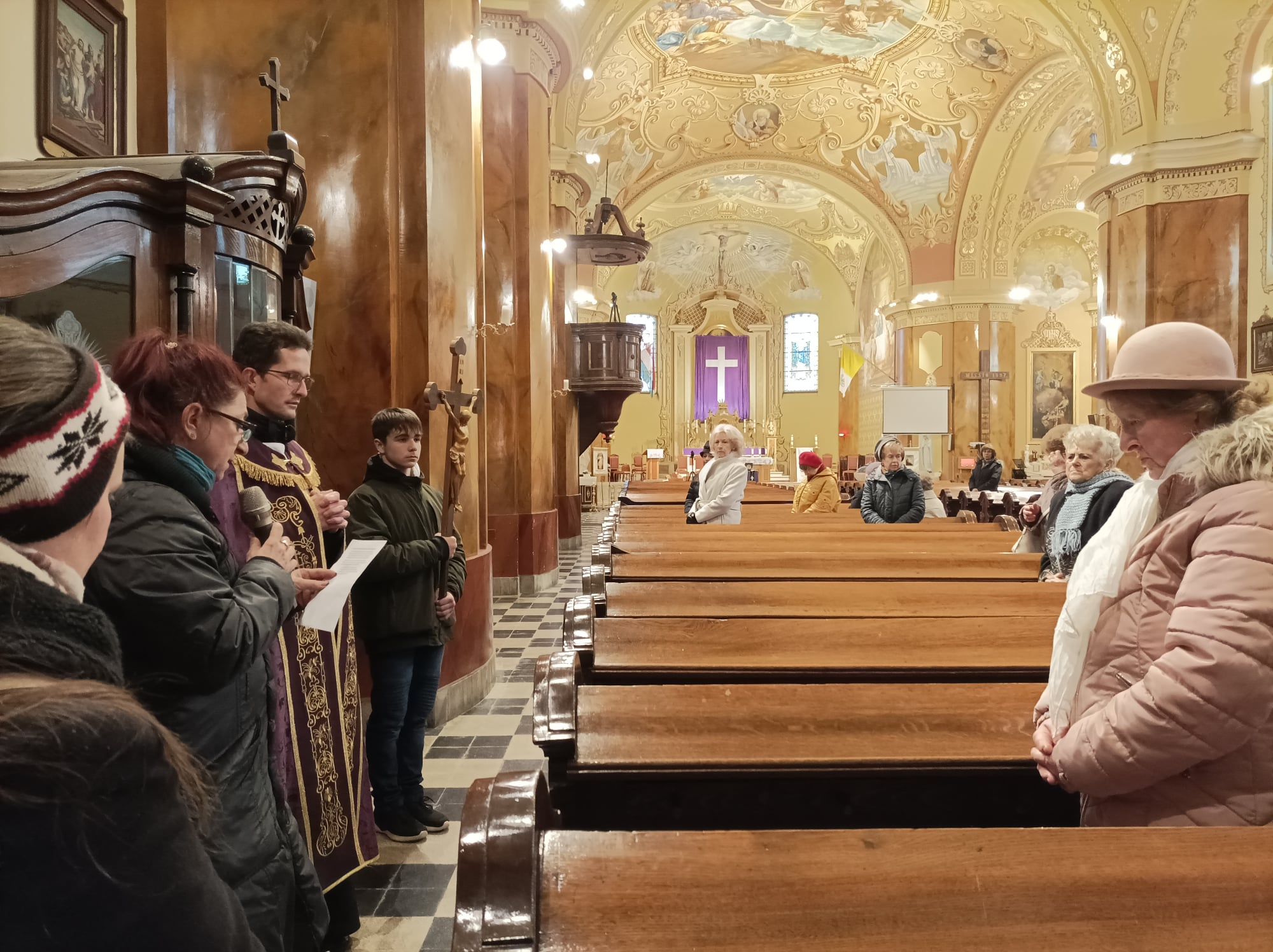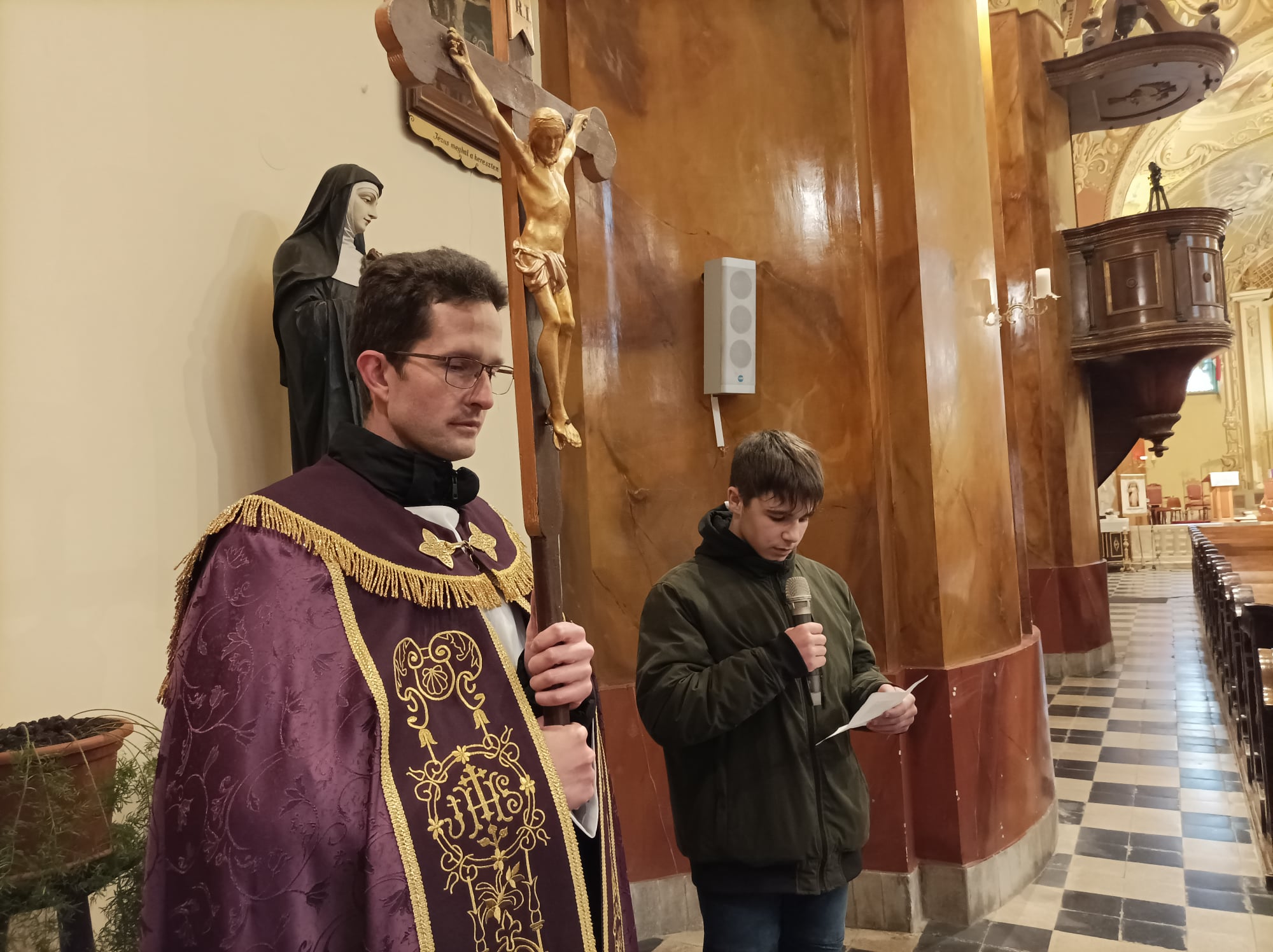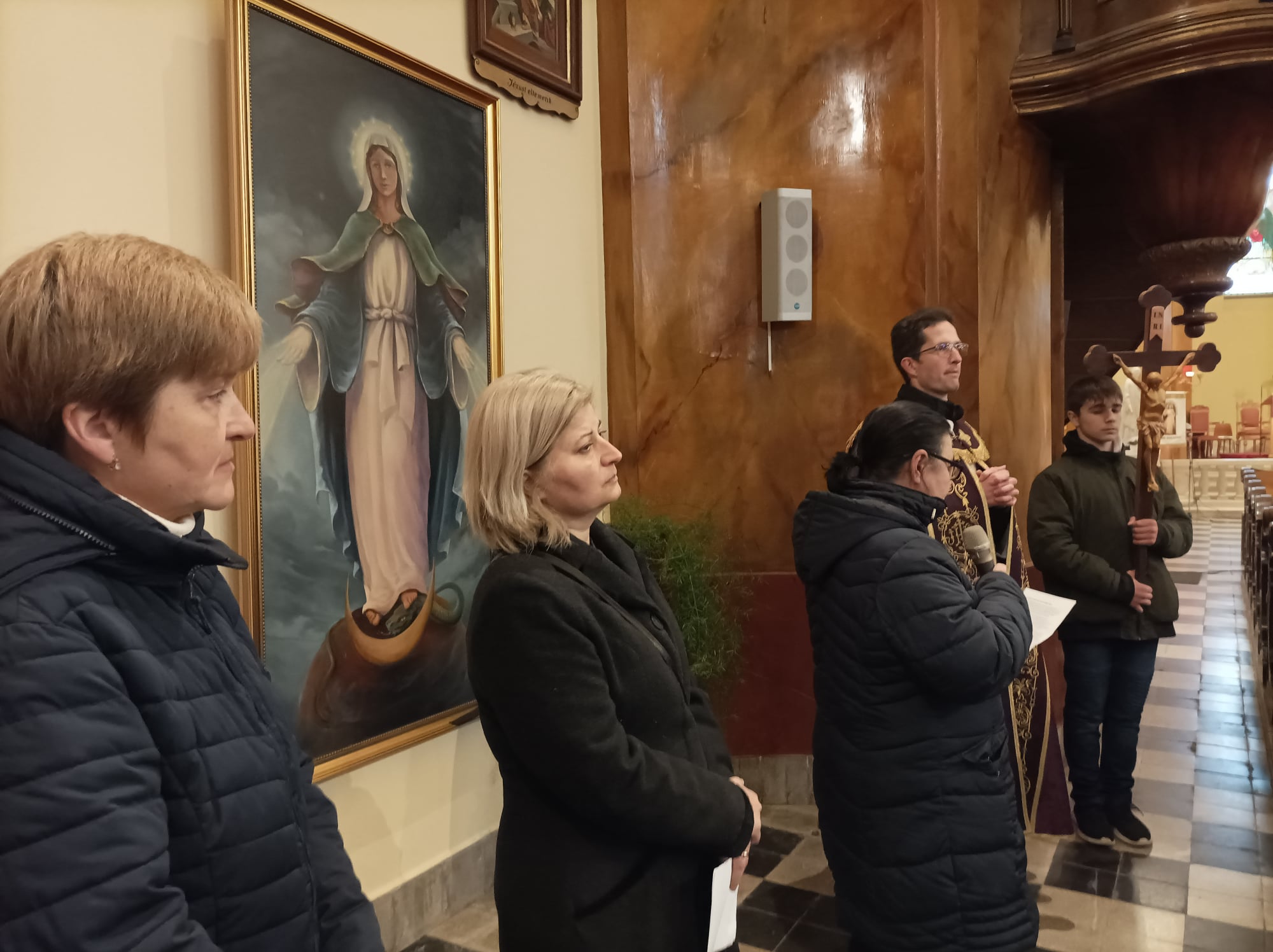 Katolikus iskolánk pedagógiai munkájának fontos része a hitoktatás. Ennek egyik pillére a példamutatás. Tanári közösségünk pénteken délután a templomban végig járta a keresztút állomásait. A stációknál felolvasott szövegek Krisztus urunk szenvedésével párhuzamba állították nevelési munkánk nehézségeit. Imáinkkal urunk segítségét kértük ezek leküzdéséhez, a benne lévő szeretet meglátásához.