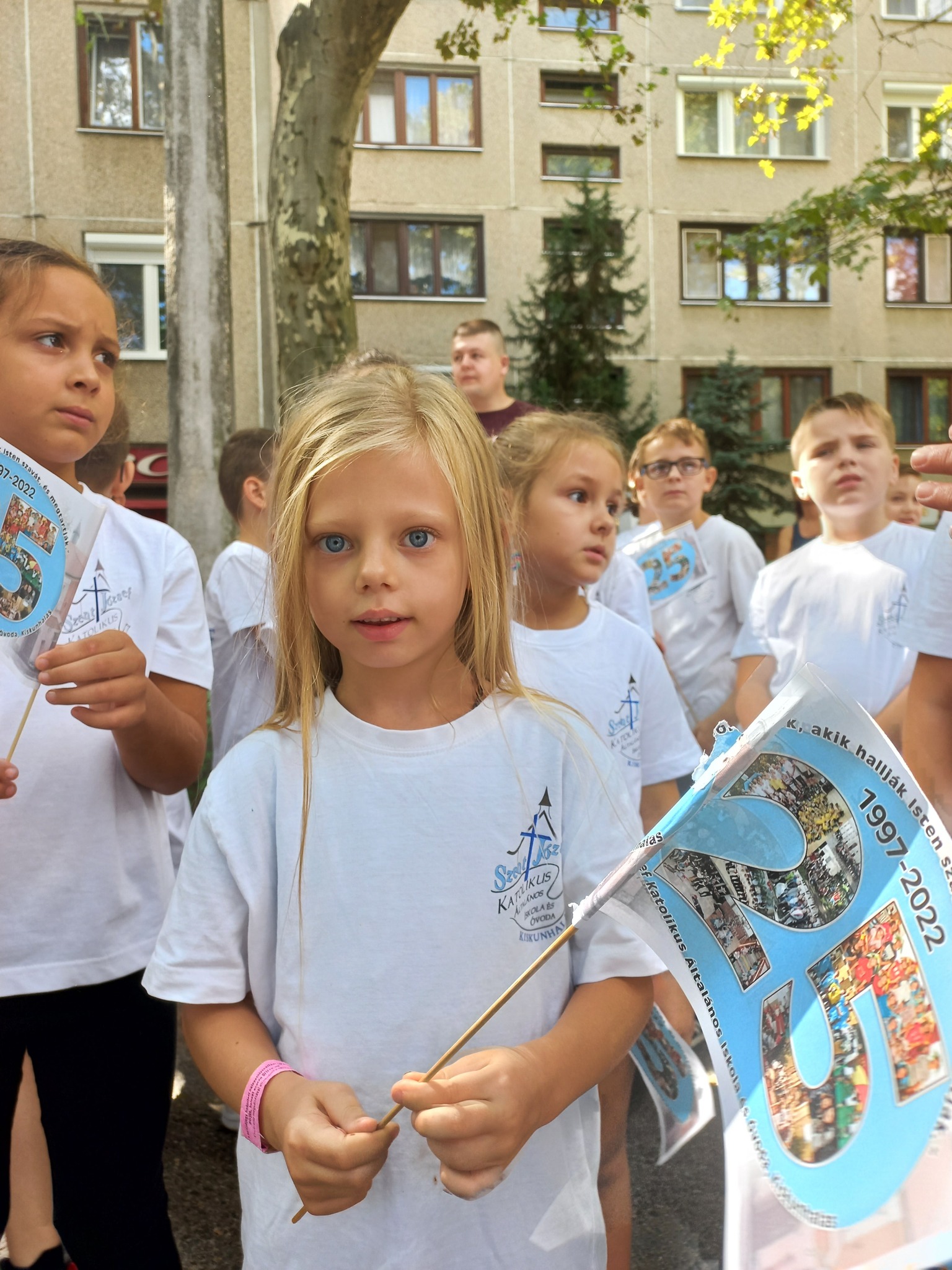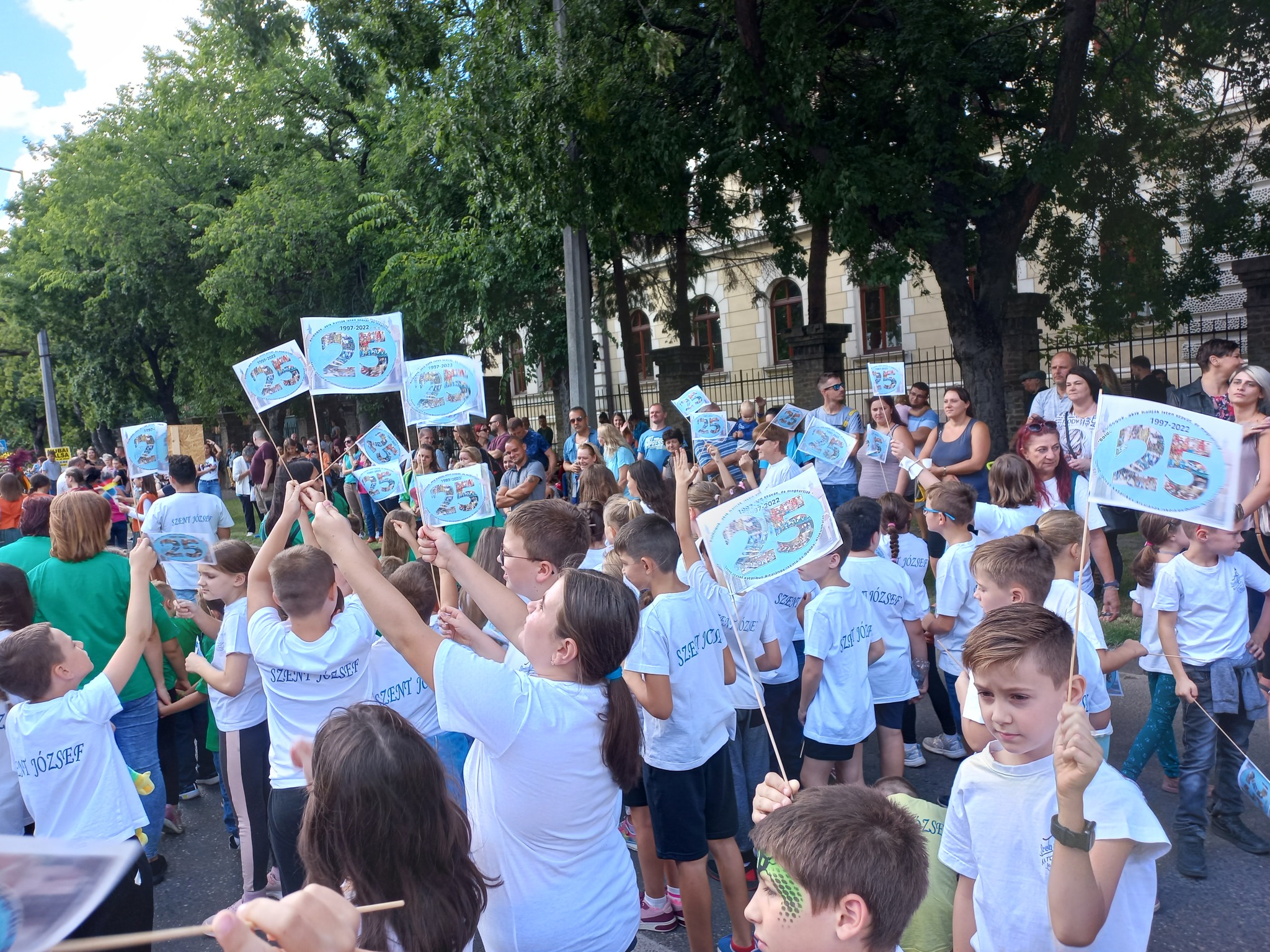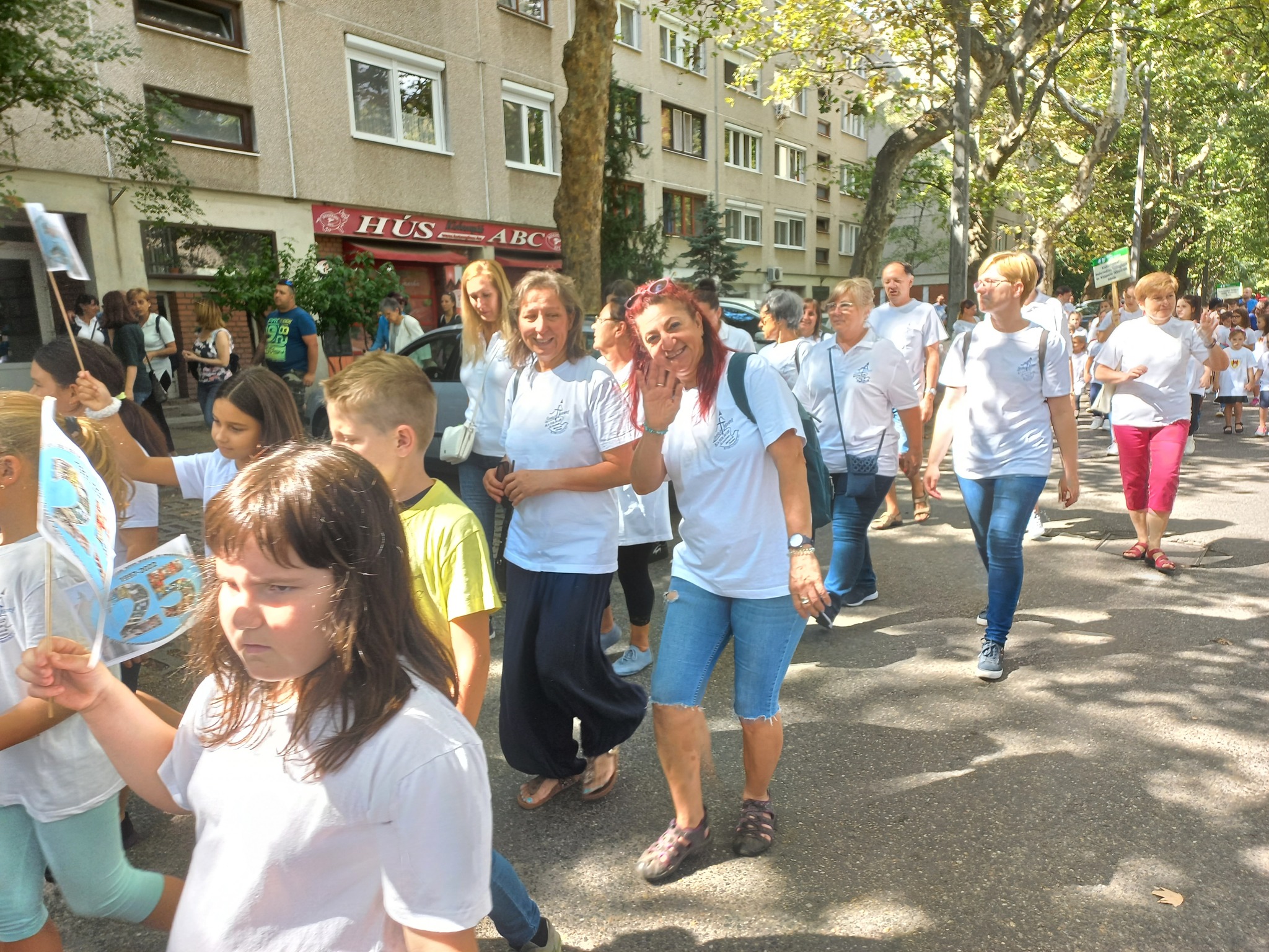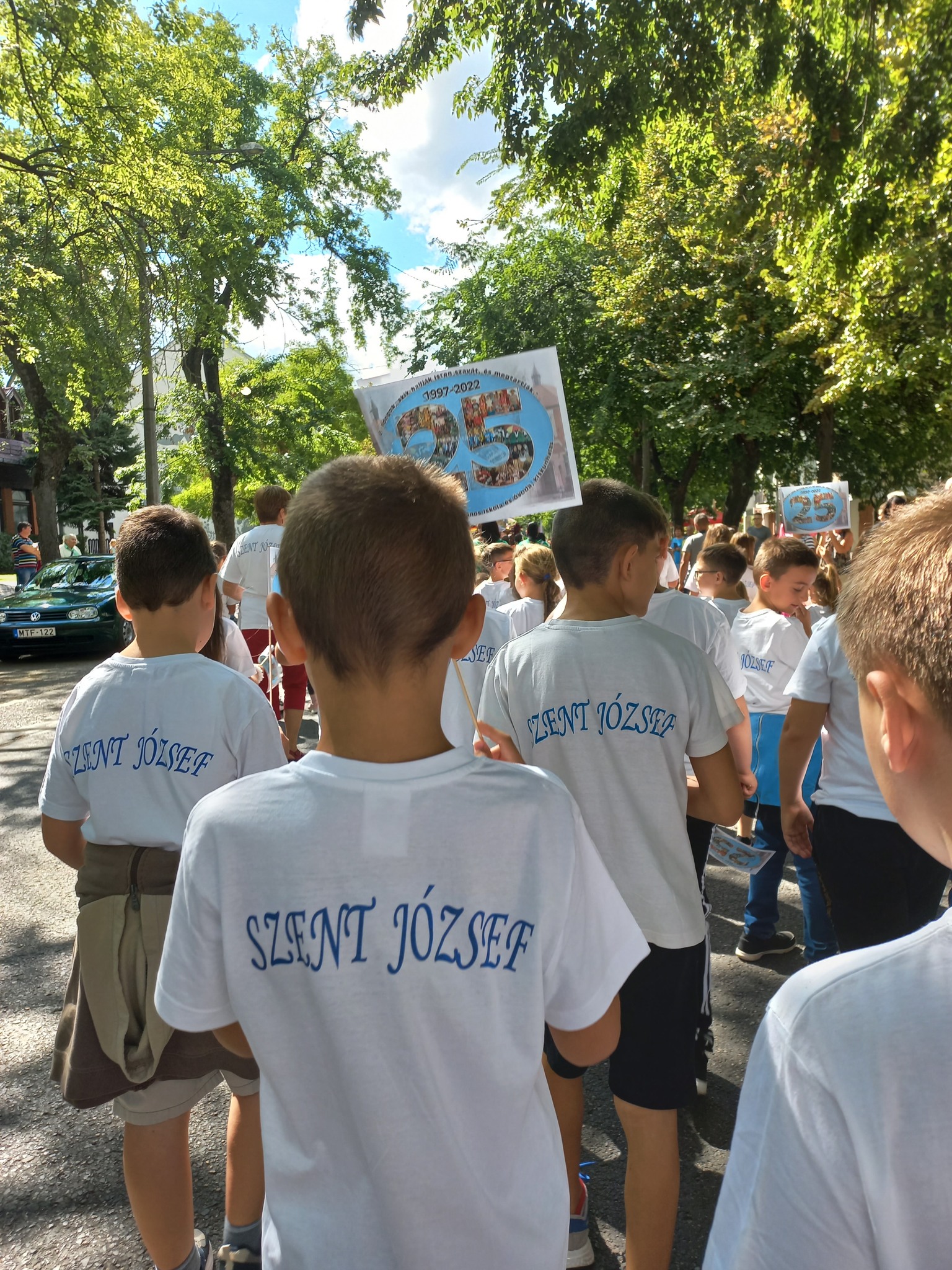 A szüreti felvonuláson iskolánkat a 3. évfolyamosok képviselték. Nagy örömünkre szolgált, hogy több osztályból is csatlakoztak diákjaink a pedagógusok zárta menethez. Fehér "szentjózsefes" pólót viselő, kék-fehér képes zászlót lobogtató vidám csapat kiváltotta a nézelődők tetszését.
