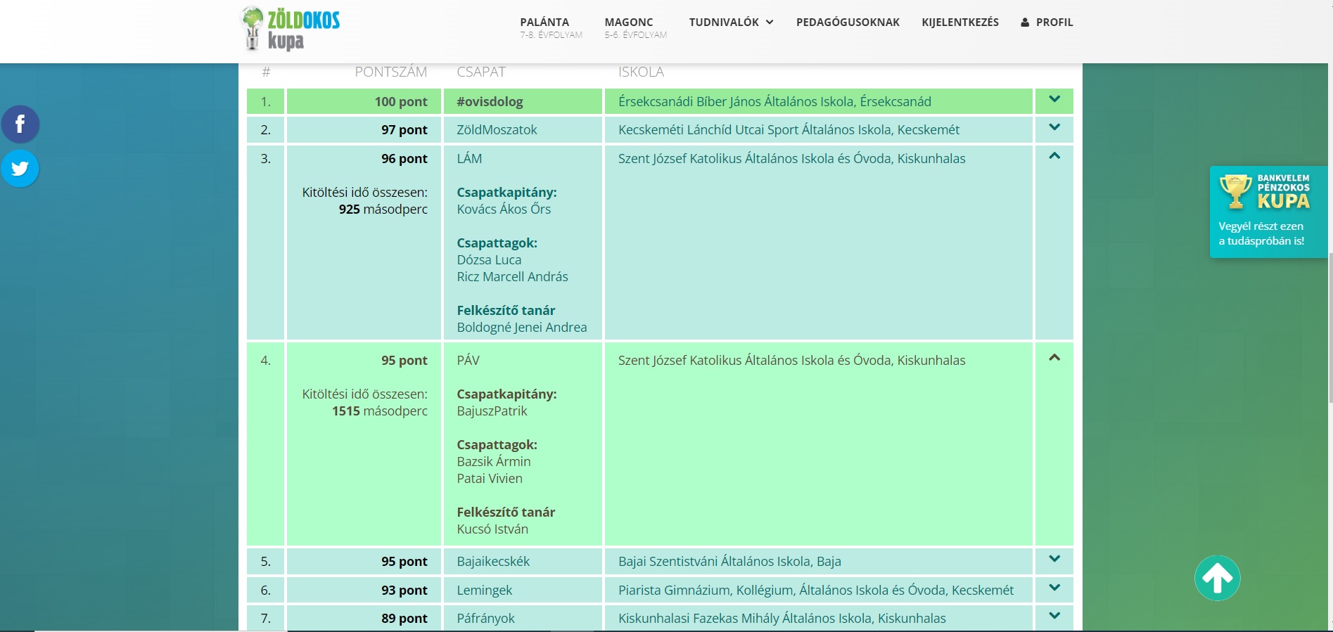A fenntarthatósági témahétre készülve, iskolánk két csapata vett részt a ZöldOkos Kupa Palánta versenyén, melyen a megyei döntőig jutottak. A többfordulós fenntarthatósági tudáspróbán 7-8. évfolyamos hazai és határon túli magyar diákokkal mérték össze tudásukat. A versenyre készülés során nagyon sok hasznos tudással gazdagodtak, szélesedett látókörük, fejlődött rendszerszemléletük.