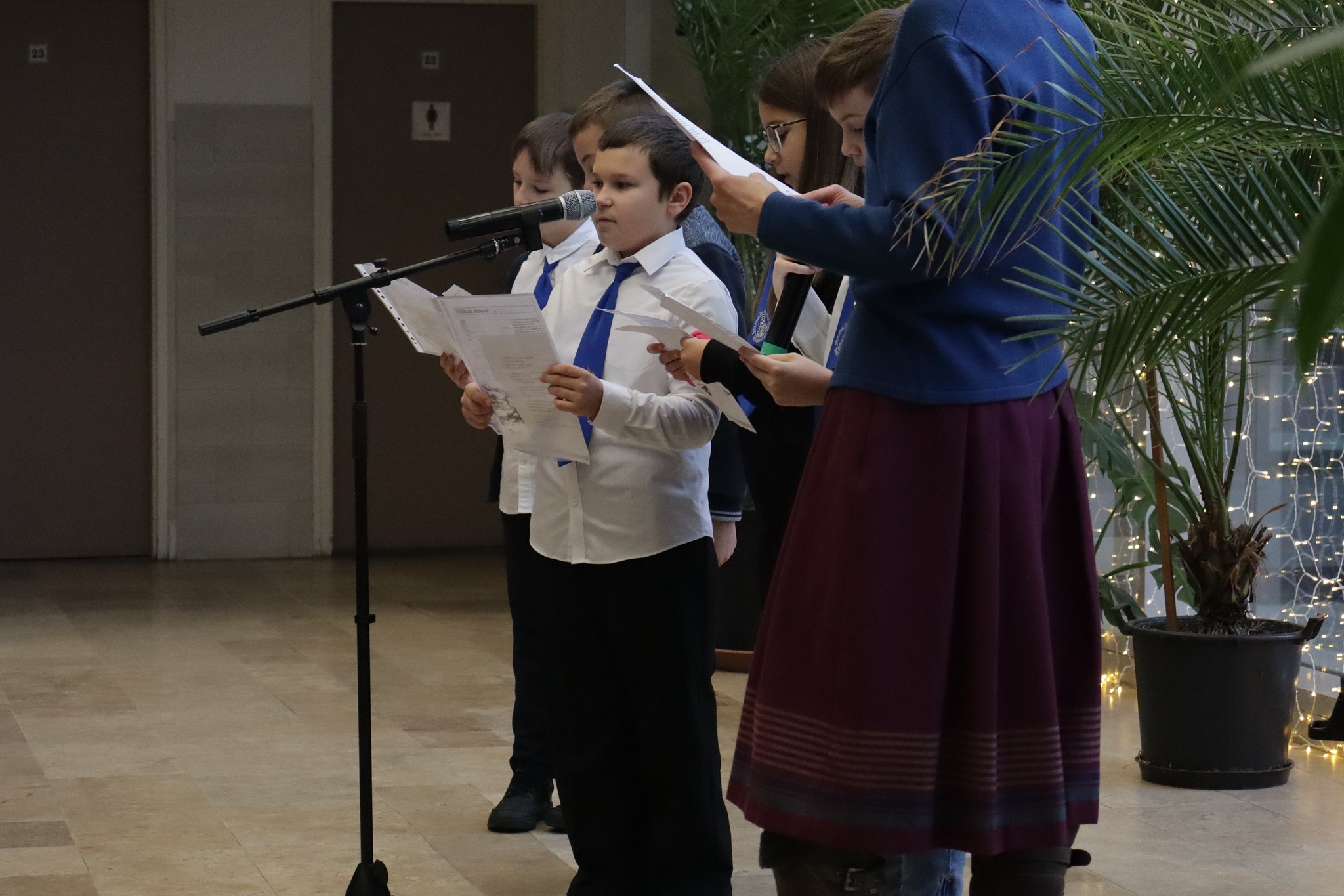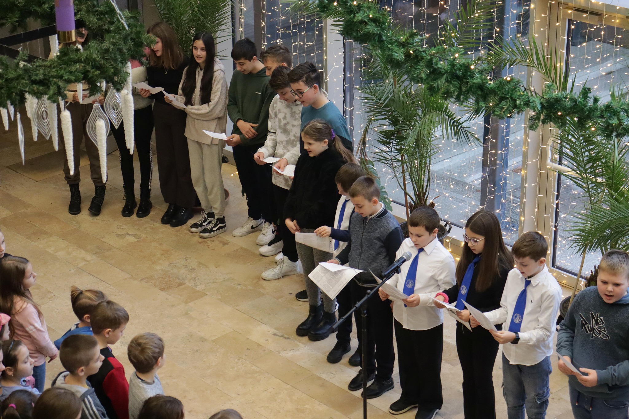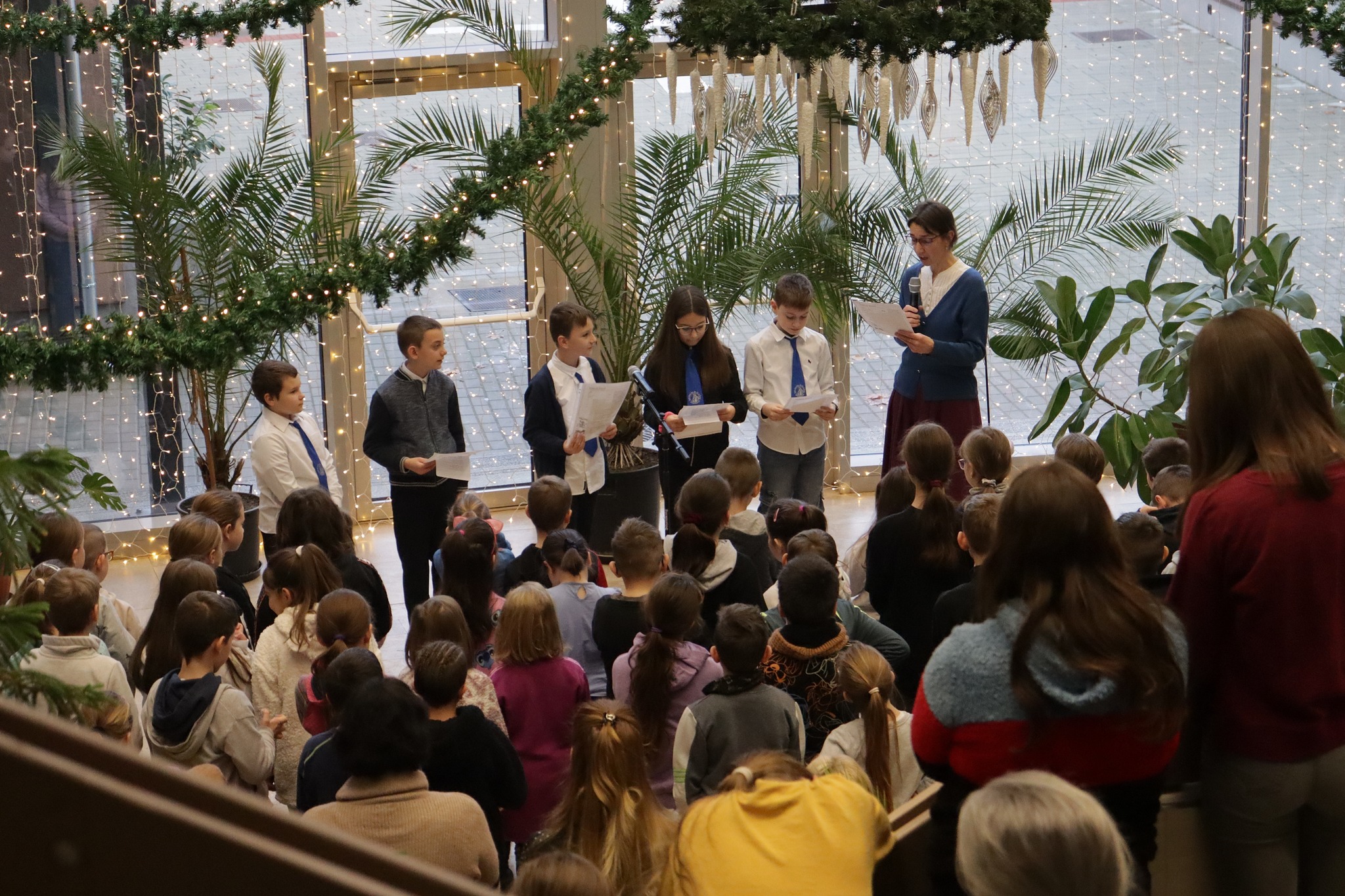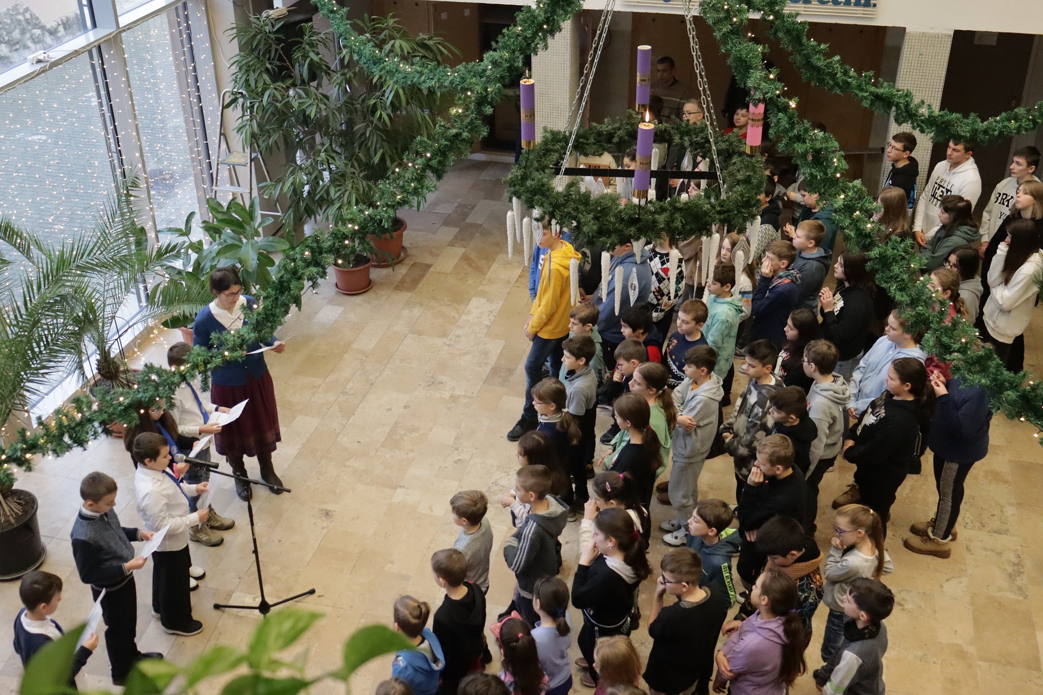 A 2. gyertyagyújtás a református diákok rövid műsorával valósult meg az aulában. 🕯 Először az egész iskola közösen elénekelte az Adventi hírnök kezdetű ének 2. versszakát.