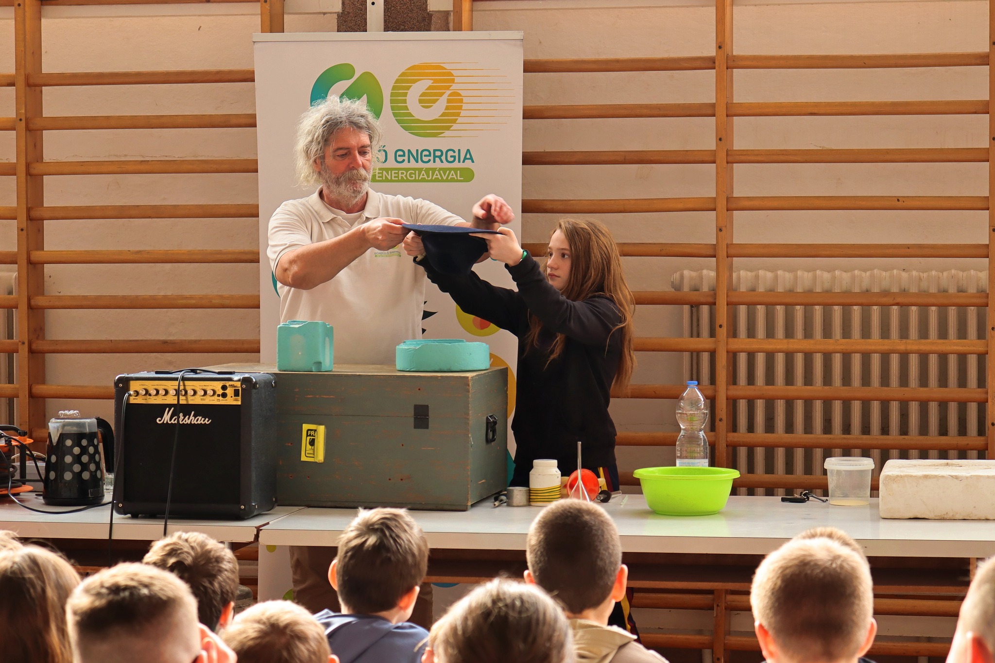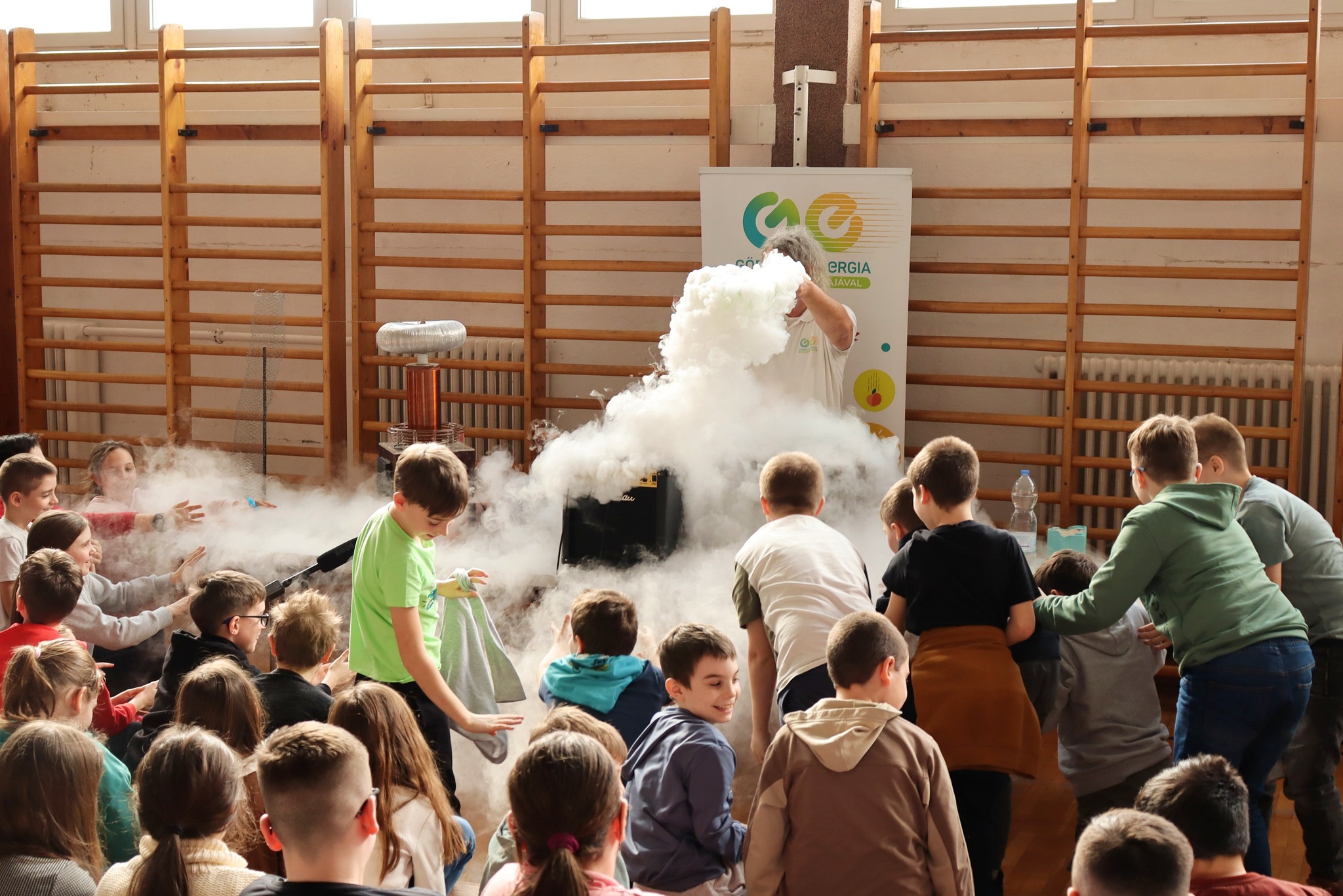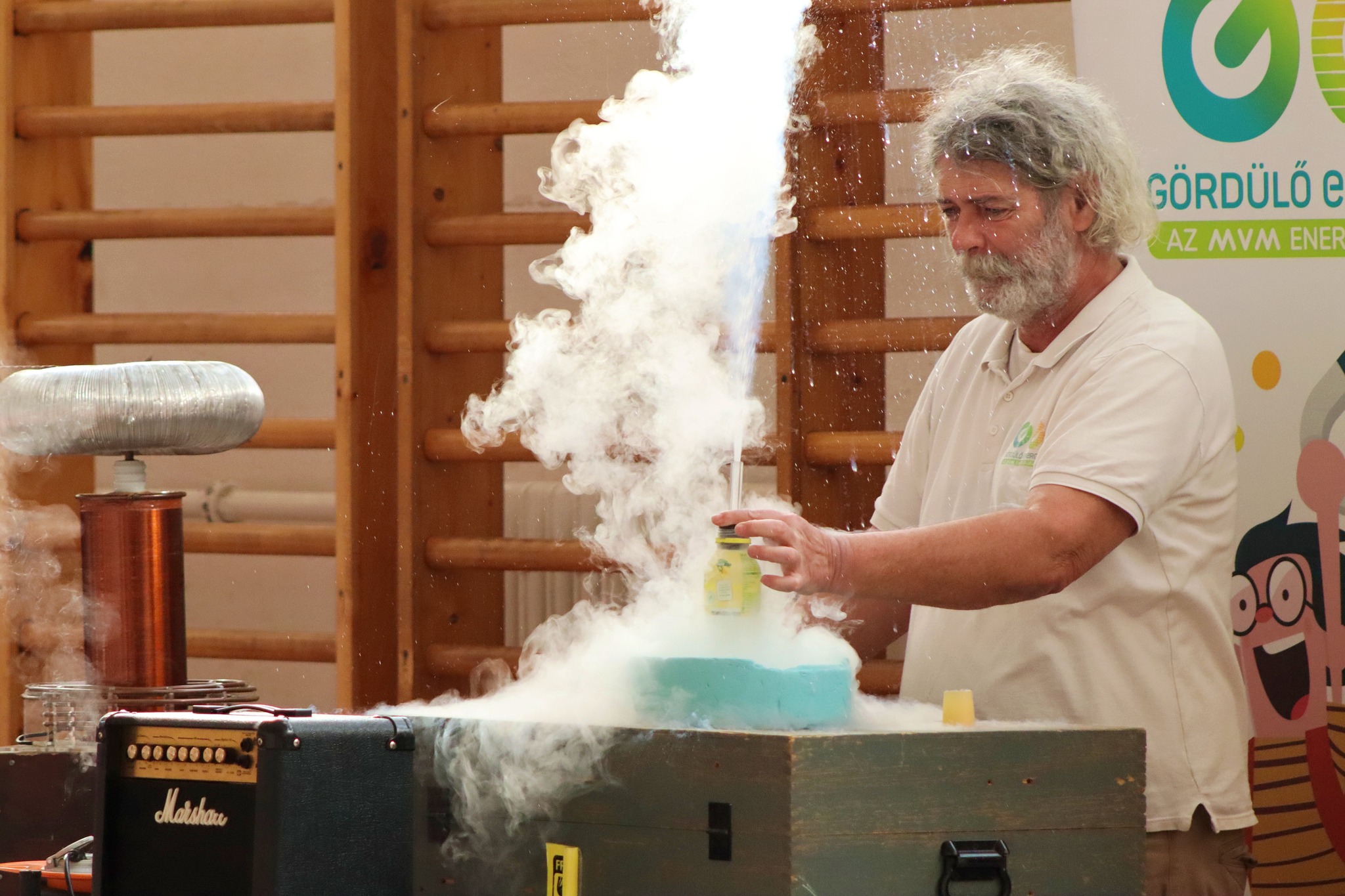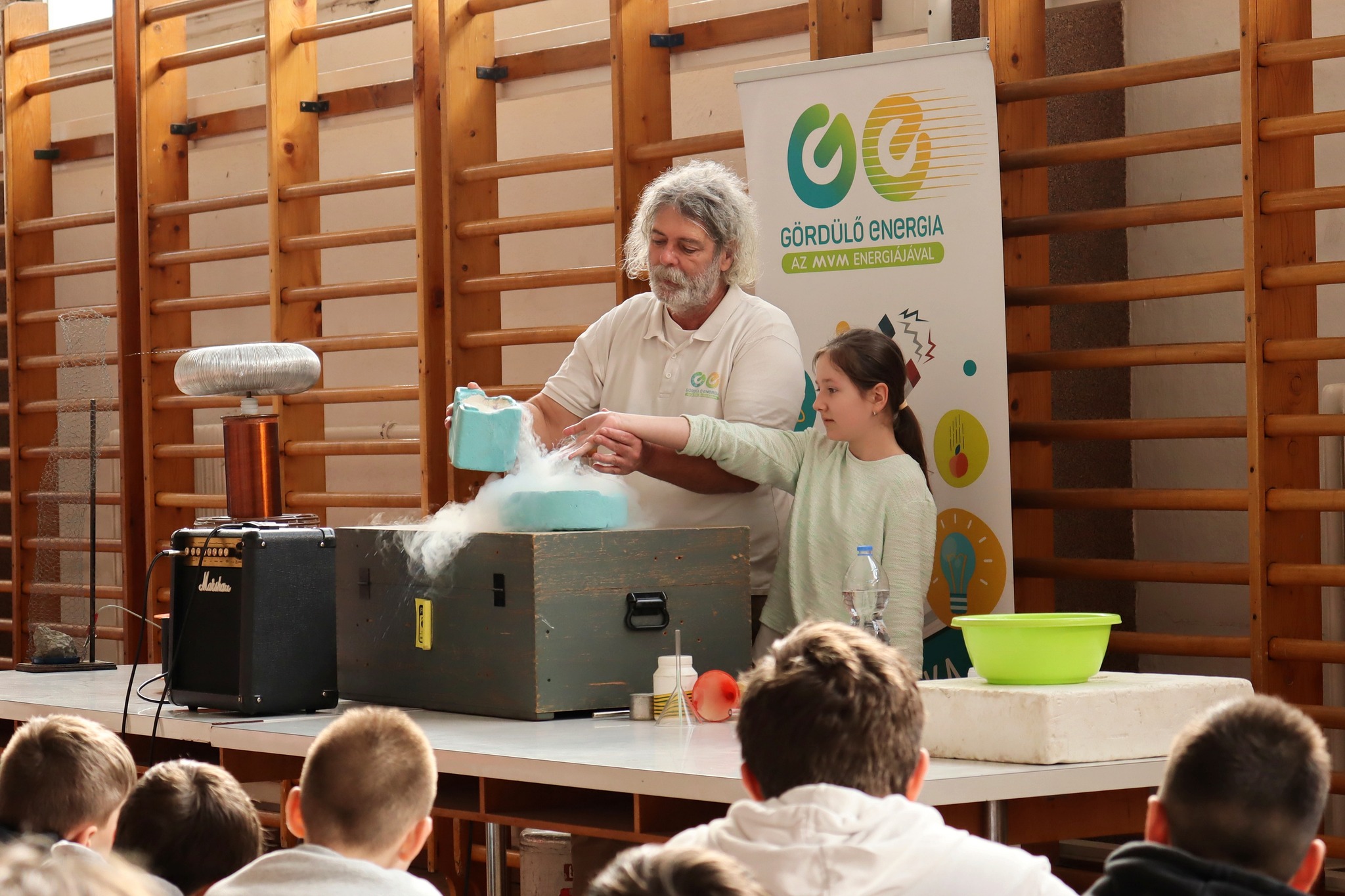 Újra ellátogatott iskolánkba a Gördülő Energia program. 4-8. évfolyamos tanulóink egy rendhagyó fizika órán vehettek részt, ahol Tóth Pál tanár úr látványos kísérleteket mutatott be a hőtan, a hangtan és az elektromosság témaköréből. A folyékony nitrogénnel végzett kísérletei különösen kiváltották a gyerekek csodálatát. Emellett a bemutatót különböző történetekkel, tudománytörténeti érdekességekkel színesítette: beszélt Pitagoraszról és Tesláról is.