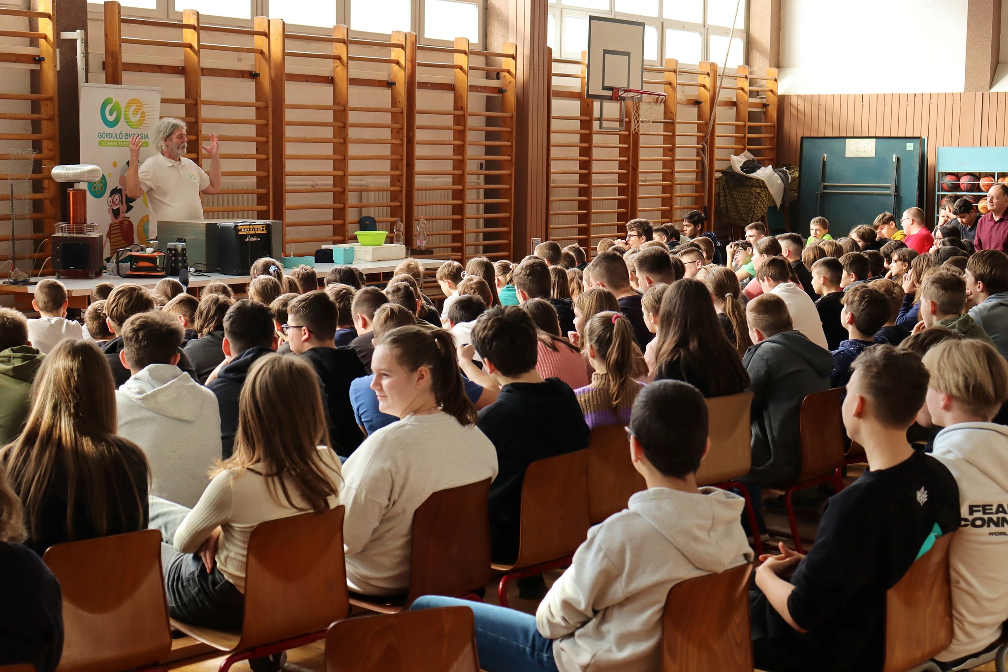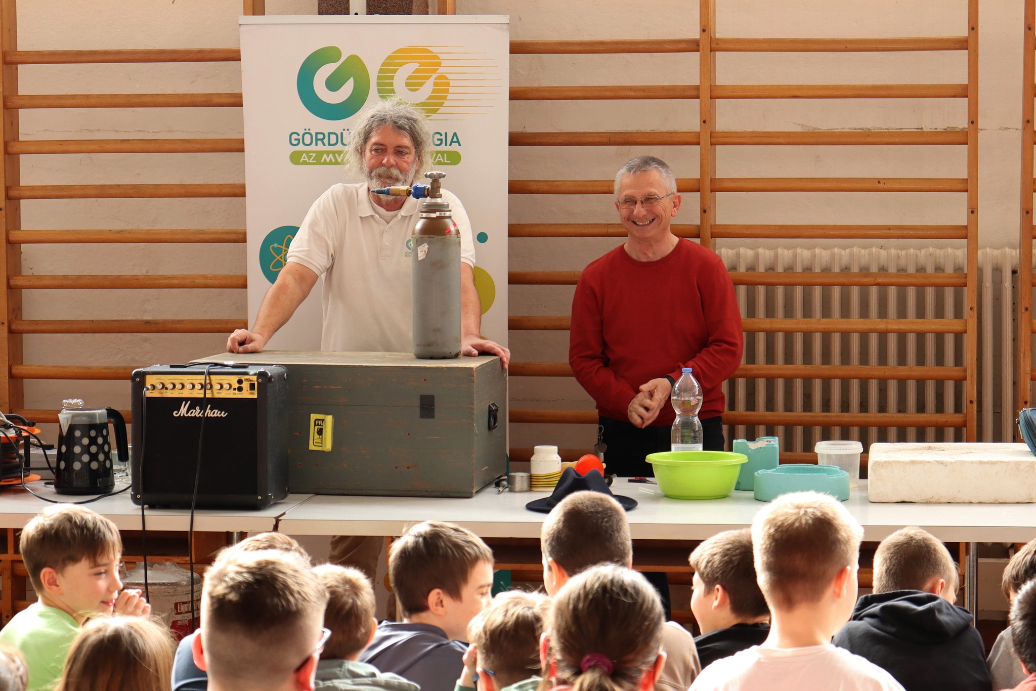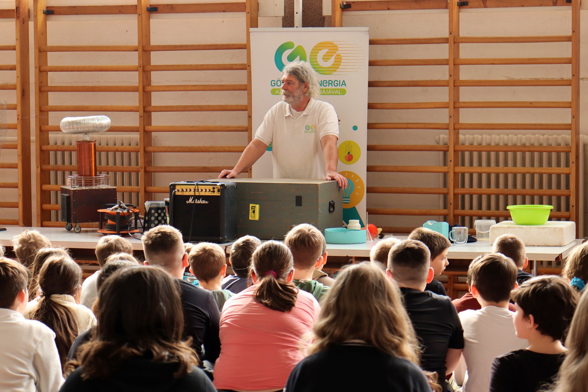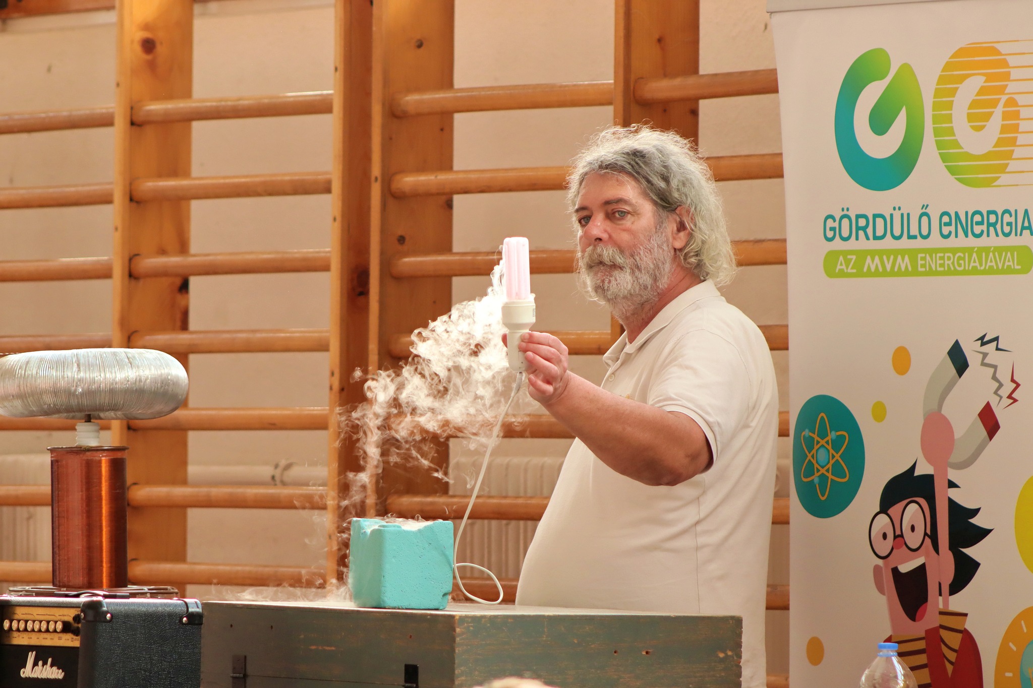 Újra ellátogatott iskolánkba a Gördülő Energia program. 4-8. évfolyamos tanulóink egy rendhagyó fizika órán vehettek részt, ahol Tóth Pál tanár úr látványos kísérleteket mutatott be a hőtan, a hangtan és az elektromosság témaköréből. A folyékony nitrogénnel végzett kísérletei különösen kiváltották a gyerekek csodálatát. Emellett a bemutatót különböző történetekkel, tudománytörténeti érdekességekkel színesítette: beszélt Pitagoraszról és Tesláról is.