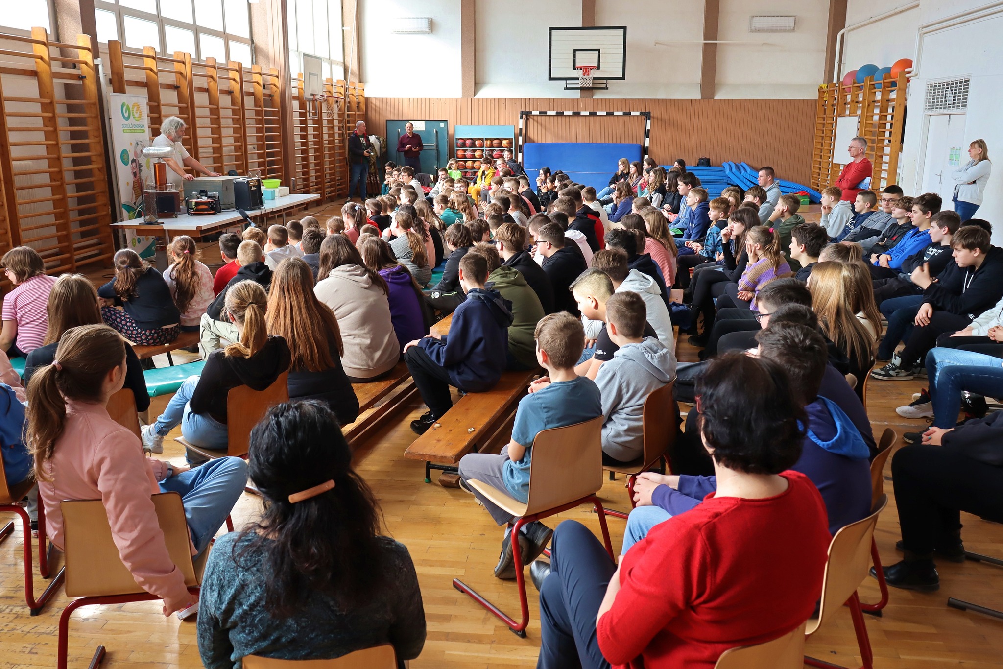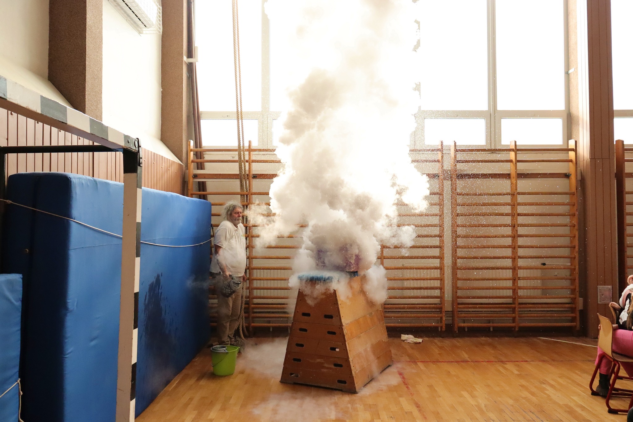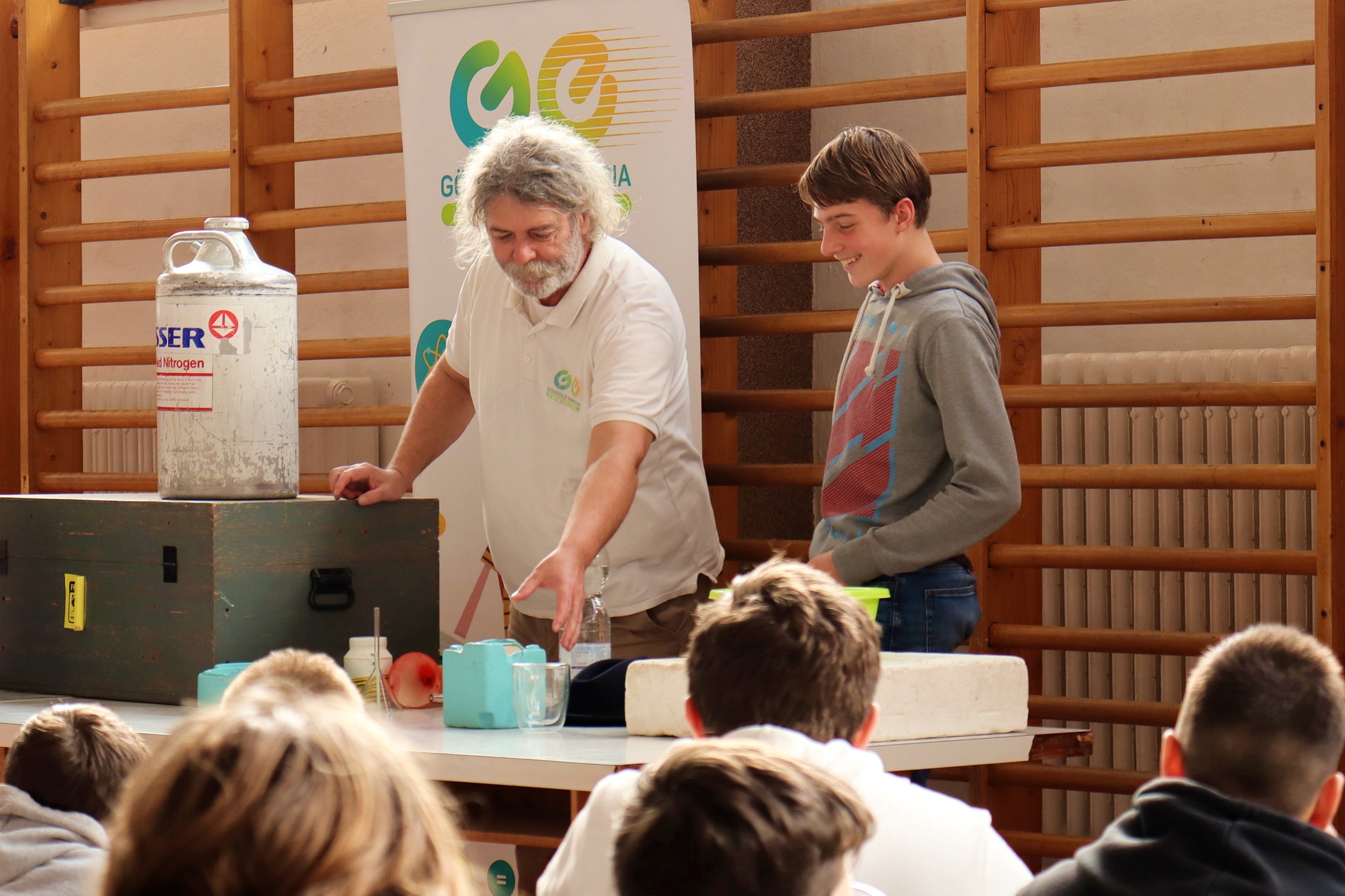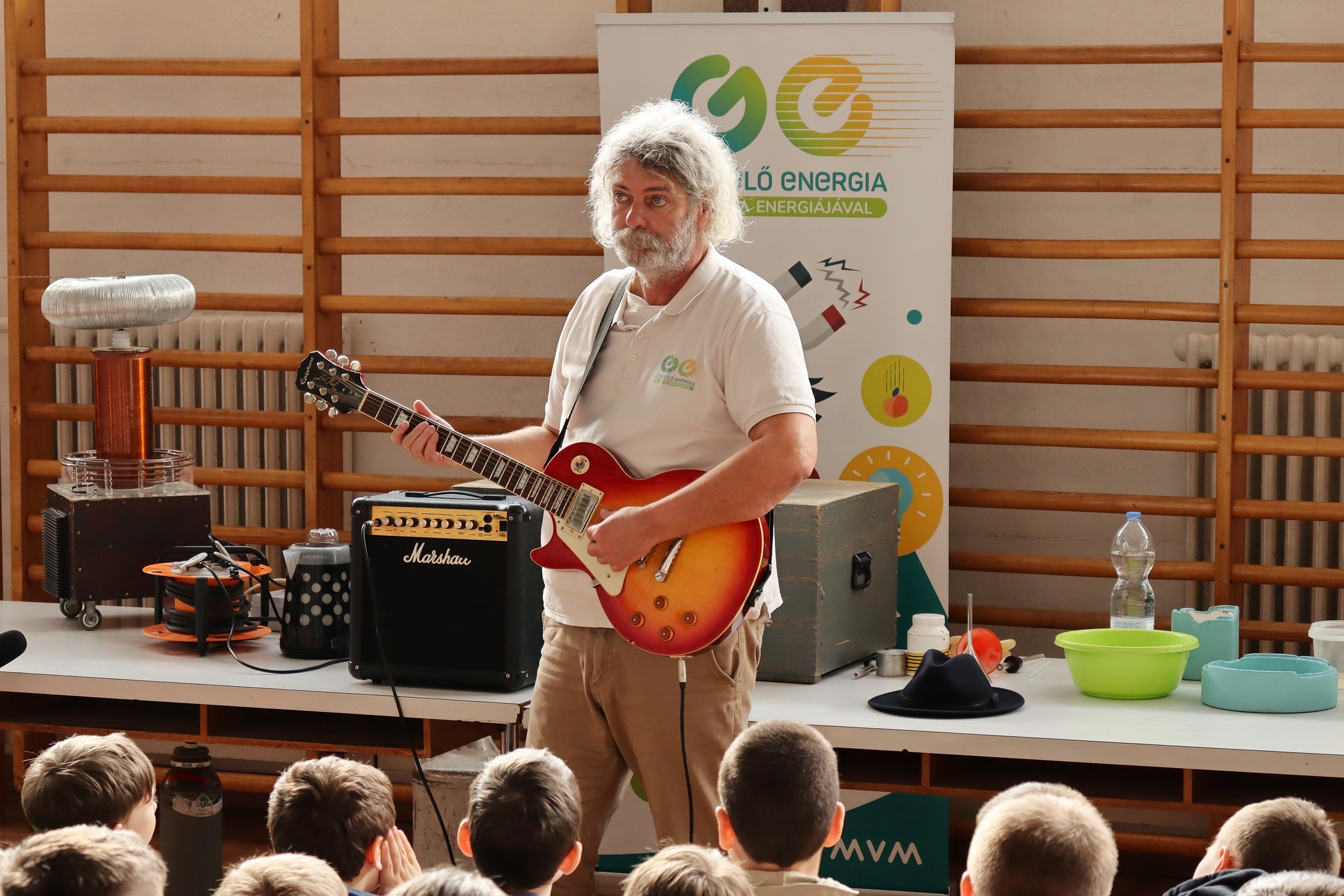 Újra ellátogatott iskolánkba a Gördülő Energia program. 4-8. évfolyamos tanulóink egy rendhagyó fizika órán vehettek részt, ahol Tóth Pál tanár úr látványos kísérleteket mutatott be a hőtan, a hangtan és az elektromosság témaköréből. A folyékony nitrogénnel végzett kísérletei különösen kiváltották a gyerekek csodálatát. Emellett a bemutatót különböző történetekkel, tudománytörténeti érdekességekkel színesítette: beszélt Pitagoraszról és Tesláról is.