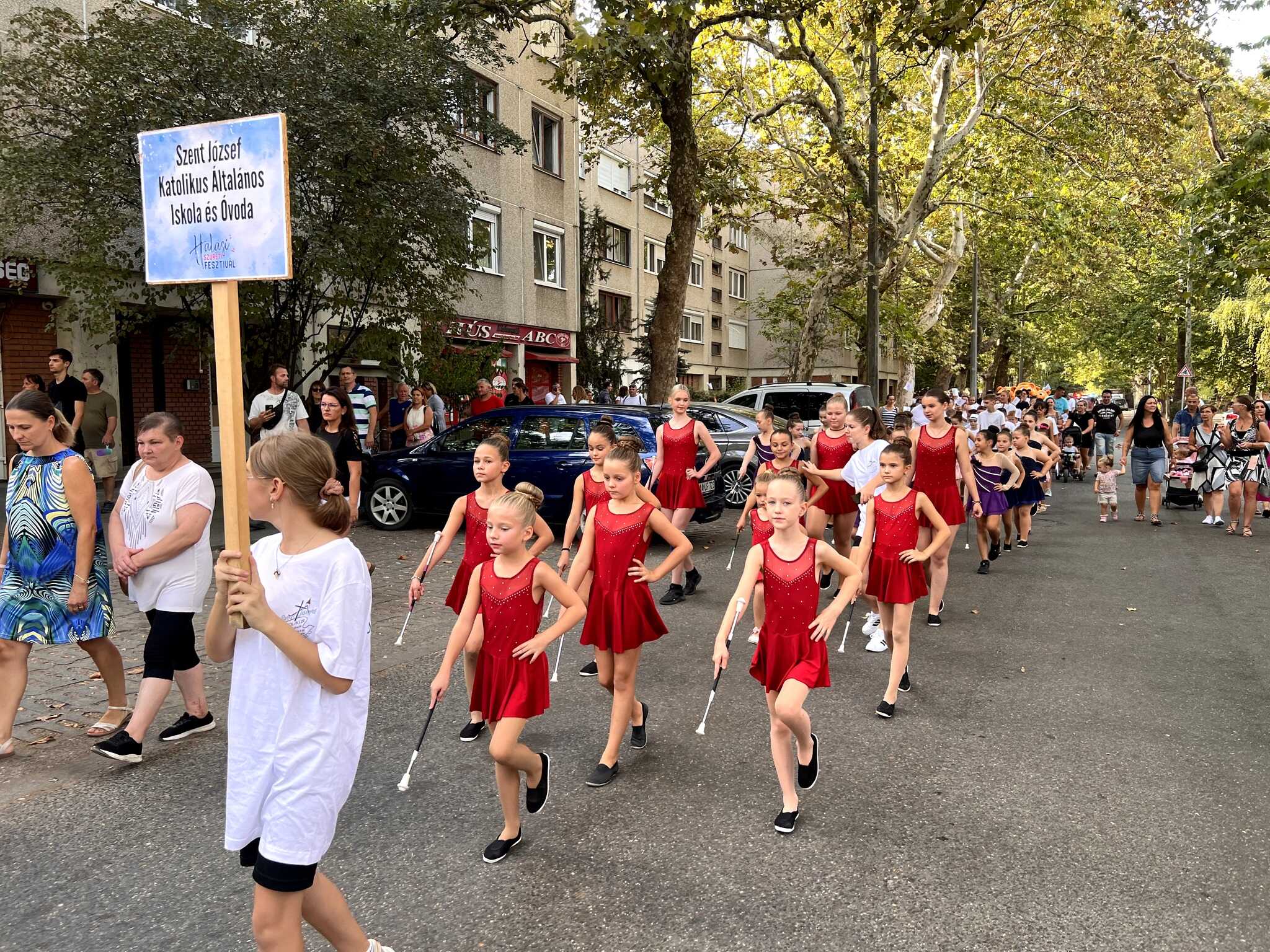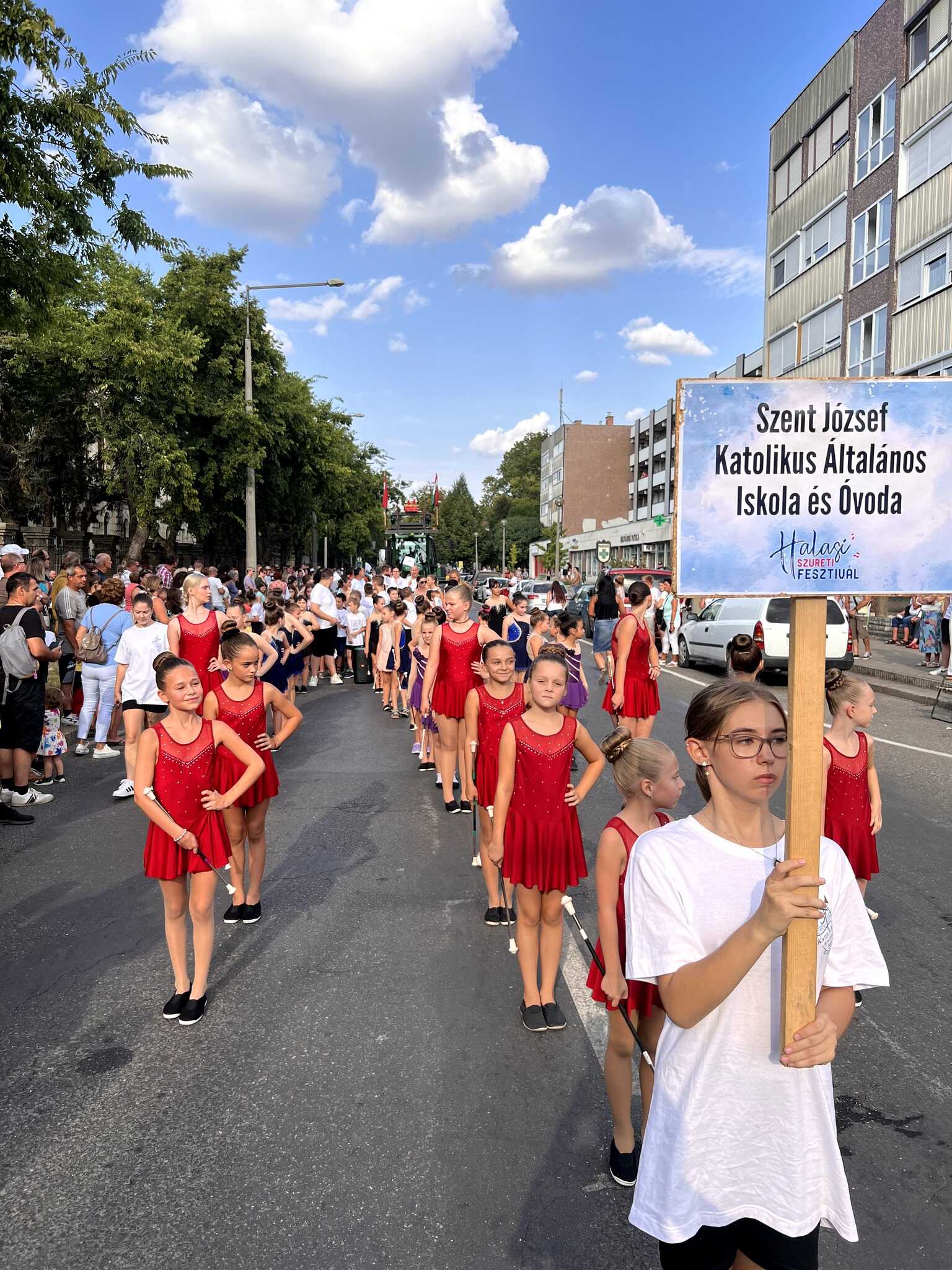 A szüreti felvonuláson iskolánkat a 3. évfolyam képviselte. Nagy örömünkre szolgált, hogy több osztályból is csatlakoztak diákjaink a nézelődők közül a pedagógusok zárta menethez. Fehér "szentjózsefes" pólót viselő, az iskola logóját ábrázoló zászlót lobogtató vidám csapat kiváltotta a nézelődők tetszését. A menetet a mazsorettesek bemutatója tette színessé.