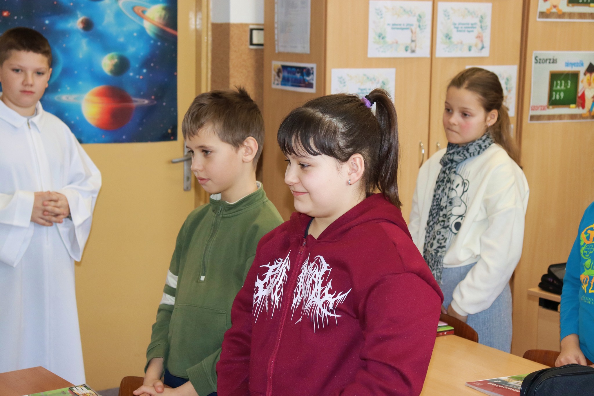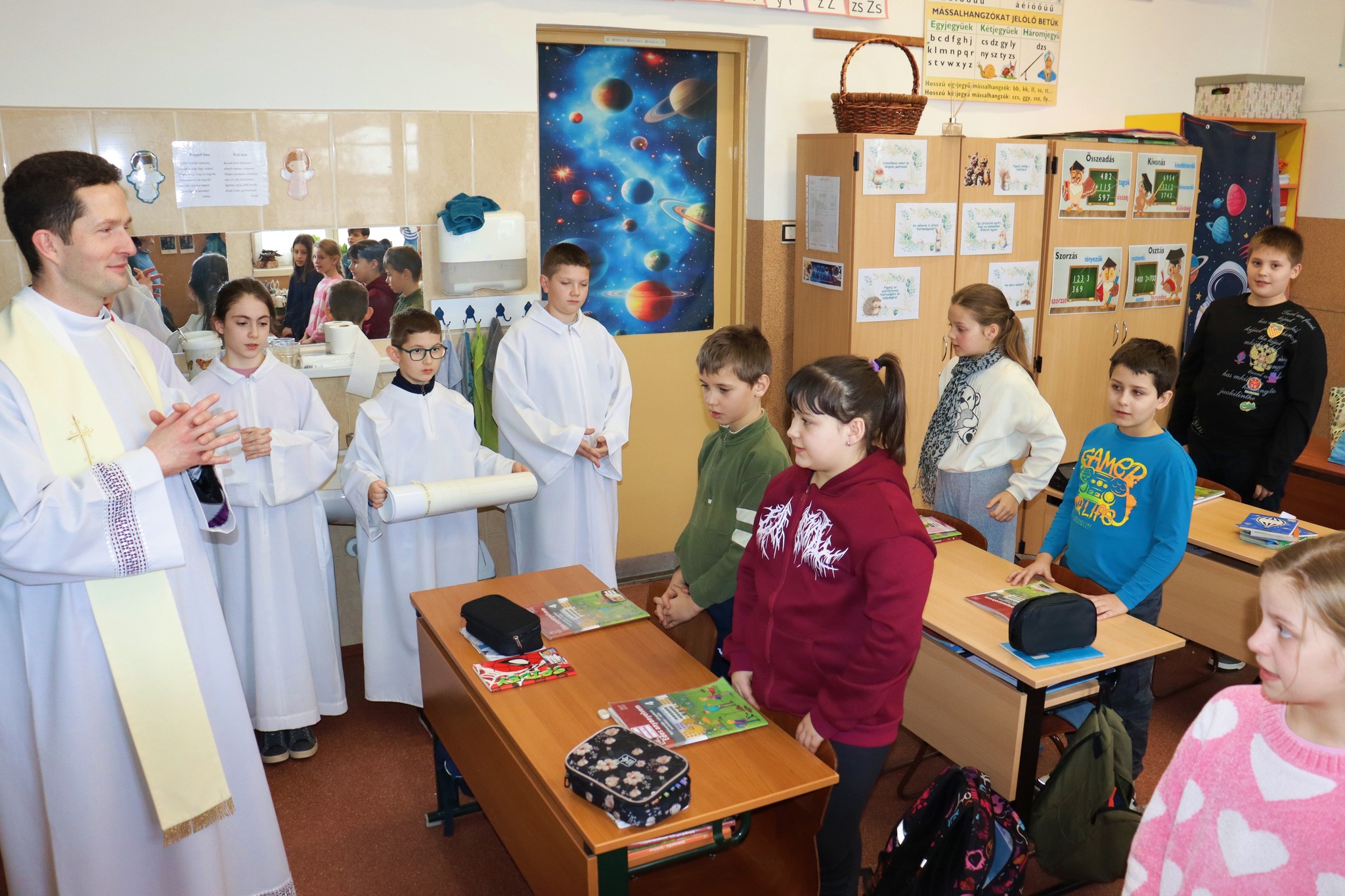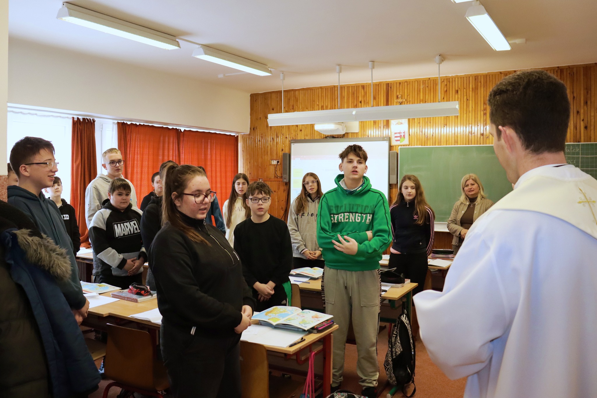 Ebből az alkalomból iskolánk tanulói szentmisén vettek részt, ahol közösen imádkoztunk és elcsendesedtünk az ünnep üzenetét átgondolva. A szentmisét követően Feri atya megáldotta az iskola épületében található helyiségeket, kérve Isten áldását diákjainkra, pedagógusainkra és az intézmény egész közösségére az előttünk álló időszakra.